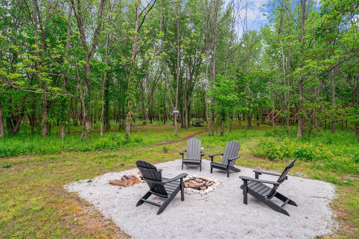 “Twisted Pines Luxury Escapes” is a Romantic treetop retreat with tranquil pond views and a glowing fountain,set on five private acres of pure privacy. Indulge in the deep soaking tub, enjoy heated towel rack, or unwind in the hot tub beneath a blanket of stars. Spend your days playing cornhole, ping pong, & paddling across the pond in a paddle boat provided , step into a full retro arcade tucked inside a classic Airstream camper.Nature,luxury, & endless fun combine for an unforgettable getaway