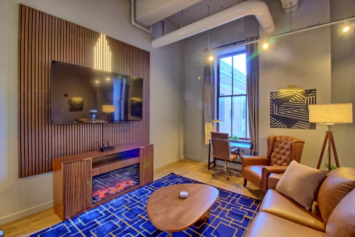 The Executive is a stunning, tastefully designed 2BR/2BA loft with 12’ ceilings + bright 7’ steel-frame windows, and an electric fireplace. Kick off your stay with a fresh-brewed latte and a bite from the mini market downstairs. Spend the afternoon lounging in the sun by the pool, or challenge your friends on the rooftop game terrace. Grill up some dogs at sunset and take a short Uber to the stadium for a Cards game, or class it up with steaks at Carmine’s and a show at the famous Fox Theatre
