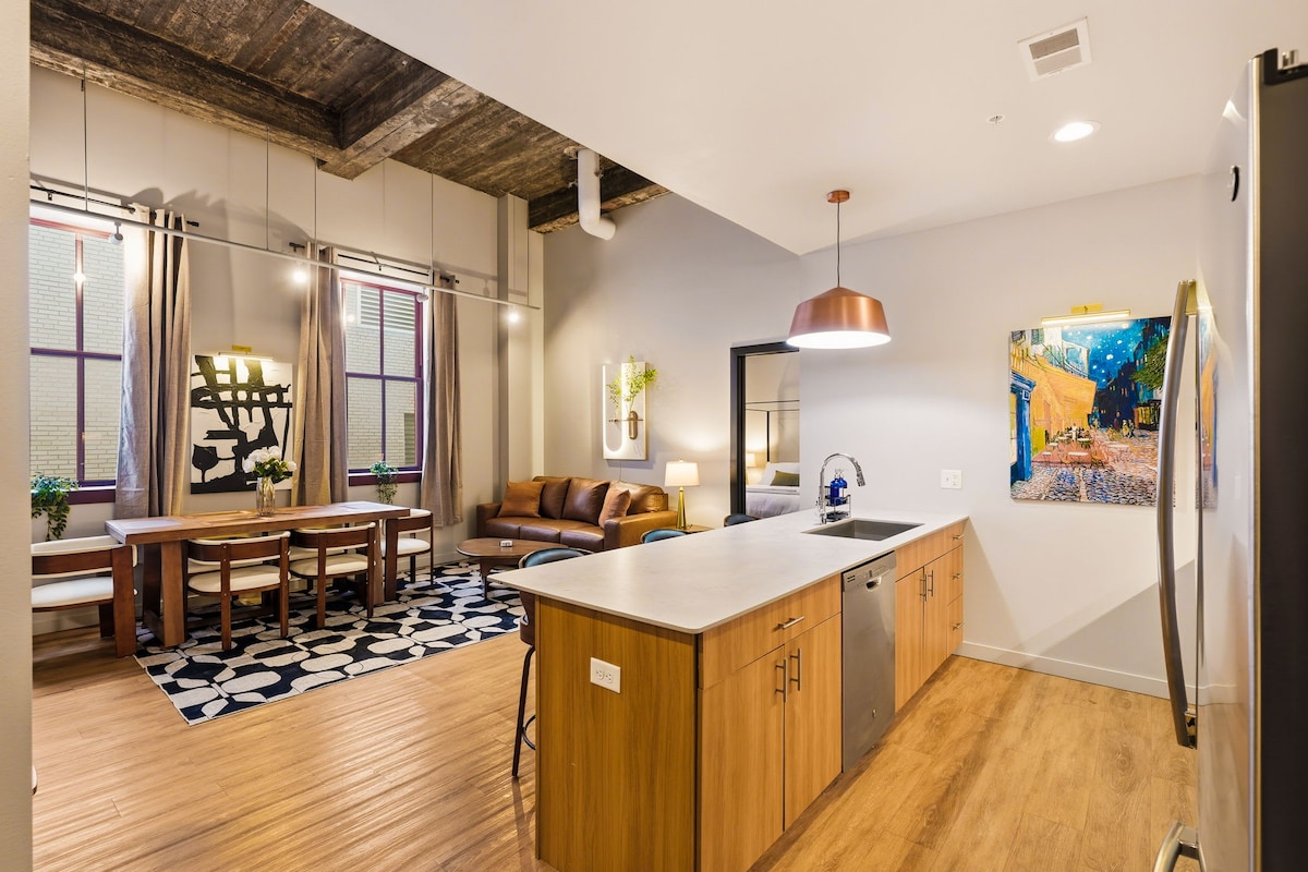 The Paragon is a stunning, tastefully designed 2BR/2BA loft with 12’ ceilings + bright 7’ steel-frame windows, and walk-in closets. Kick off your stay with a fresh-brewed latte and a bite from the mini market downstairs. Spend the afternoon lounging in the sun by the pool, or challenge your friends on the rooftop game terrace. Grill up some dogs at sunset and take a short Uber to the stadium for a Cards game, or class it up with steaks at Carmine’s and a show at the famous Fox Theatre