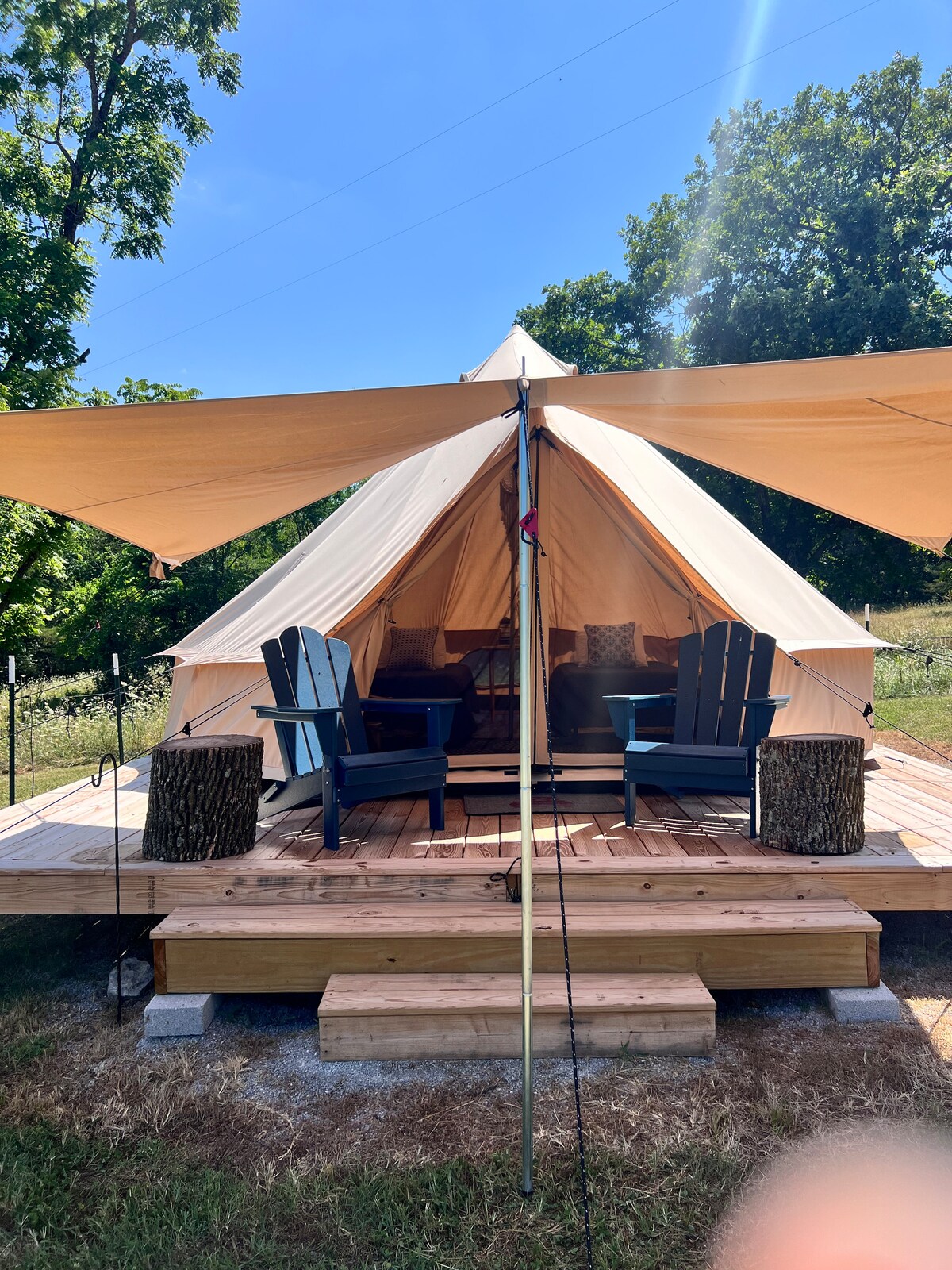 If you like camping then try a night in this Bell tent. A waterless toilet is provided just down an embankment, a large lawn with an eight hole disc golf course is available for campers. A small a/c comes with the tent but does not cool well durring the daytime but does at night and also a space heater is provided. A full sized bed is provided, with room left over but If you want friends or family to bring a couple more tents just ask and give us the details on the amount of tents and people.