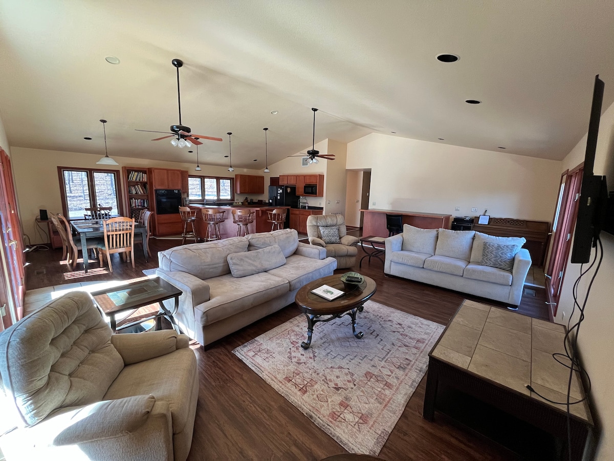 Home built in 2021 with all amenities you could want. Spacious living areas, great for families or groups - private baths for each bedroom and plenty of dining and outdoor space for fun and entertainment. Outdoor fire pits on the point and patio. A very unique property sitting on a point with incredible views onto the main channel two directions. Great set up for swimming, fishing, or hanging out watching games on the dock. 2.5 hours from KC, wifi all around the property.