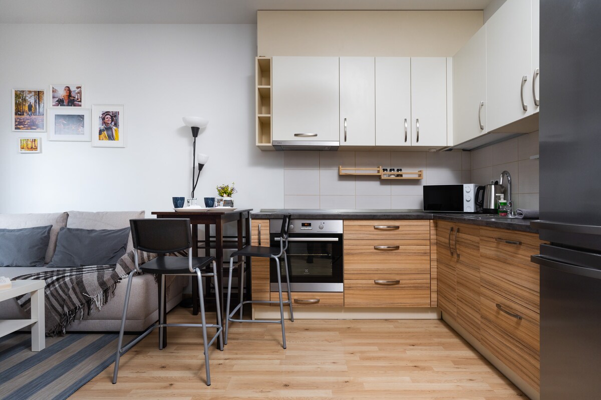 The apartment is in a strategically convenient location, near the Ozas shopping center, a large Ozas park, and a bus stop. In the apartment you will find a double bed for 2 people,two armchairs The apartment is perfect for a longer stay as there is a large fridge, oven, hob, kettle and other kitchen utensils, clothes dryer, vacuum cleaner. One of the few apartments in this building where you can lie down in the bath 🛀 Relax on the large balcony - terrace! 🤩