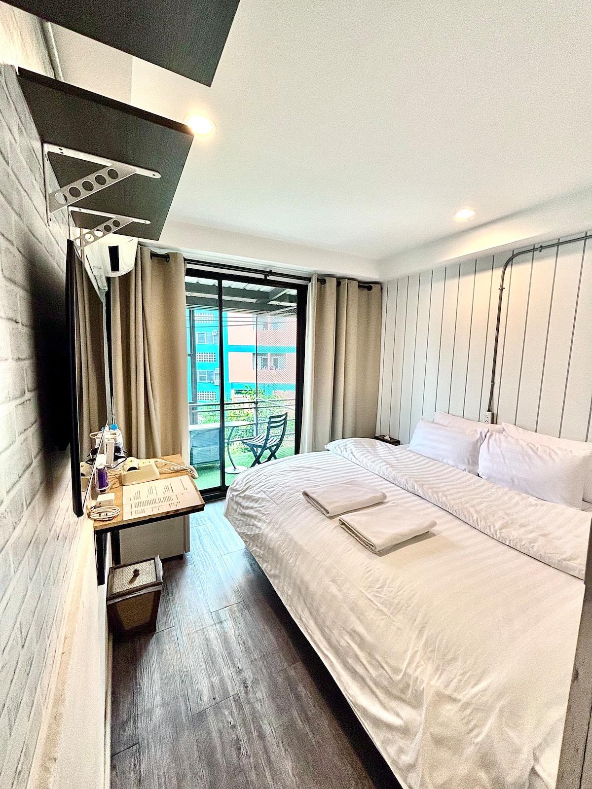 Designed to suit the needs of modern day travelers. Clean uncluttered rooms with crisp white linen, Private bathroom, aircon, TV and great Wi-Fi. Outside, relax at our swimming pool, or enjoy a snack at our cafe and restaurant where complimentary breakfast is served. You also have a guest area with refrigerator, microwave and kettle. Relax and enjoy your surroundings. We have other rooms too! Santi (3 persons) Sabai (3) and a Family Suite - 3 Bedrooms (8) Look for our listings or message us.