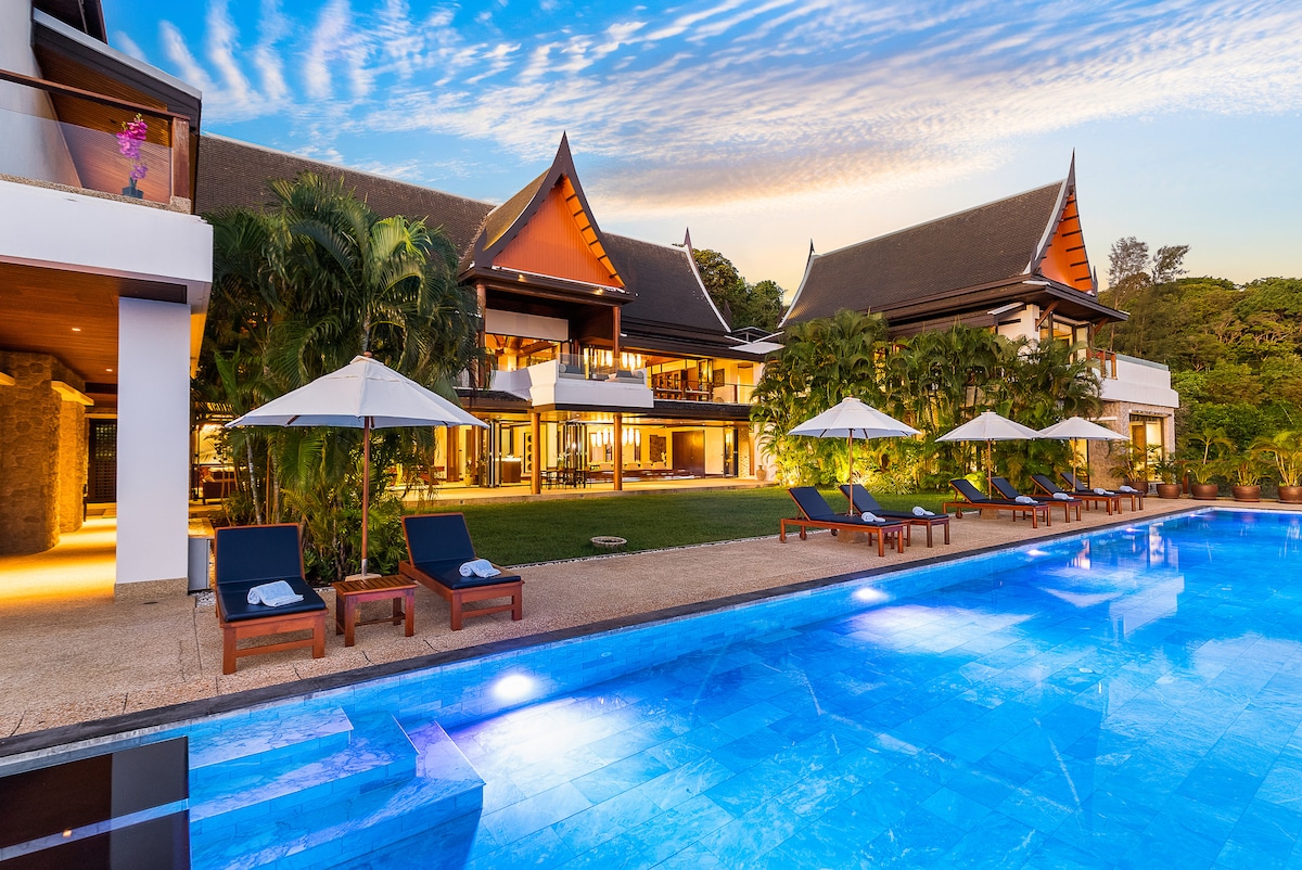 Lush headlands rise behind this trad-inspired, architect-designed Cape Amarin villa. The Andaman Sea spreads out around a pool terrace; lounging and dining areas flank a lawn. Thai-style living rooms with soaring ceilings and wall-to-wall glass are paired with a Japanese-style dining room. The beach at Kamala is 10 minutes away by car, and nightlife in Patong is a 15-minute drive.