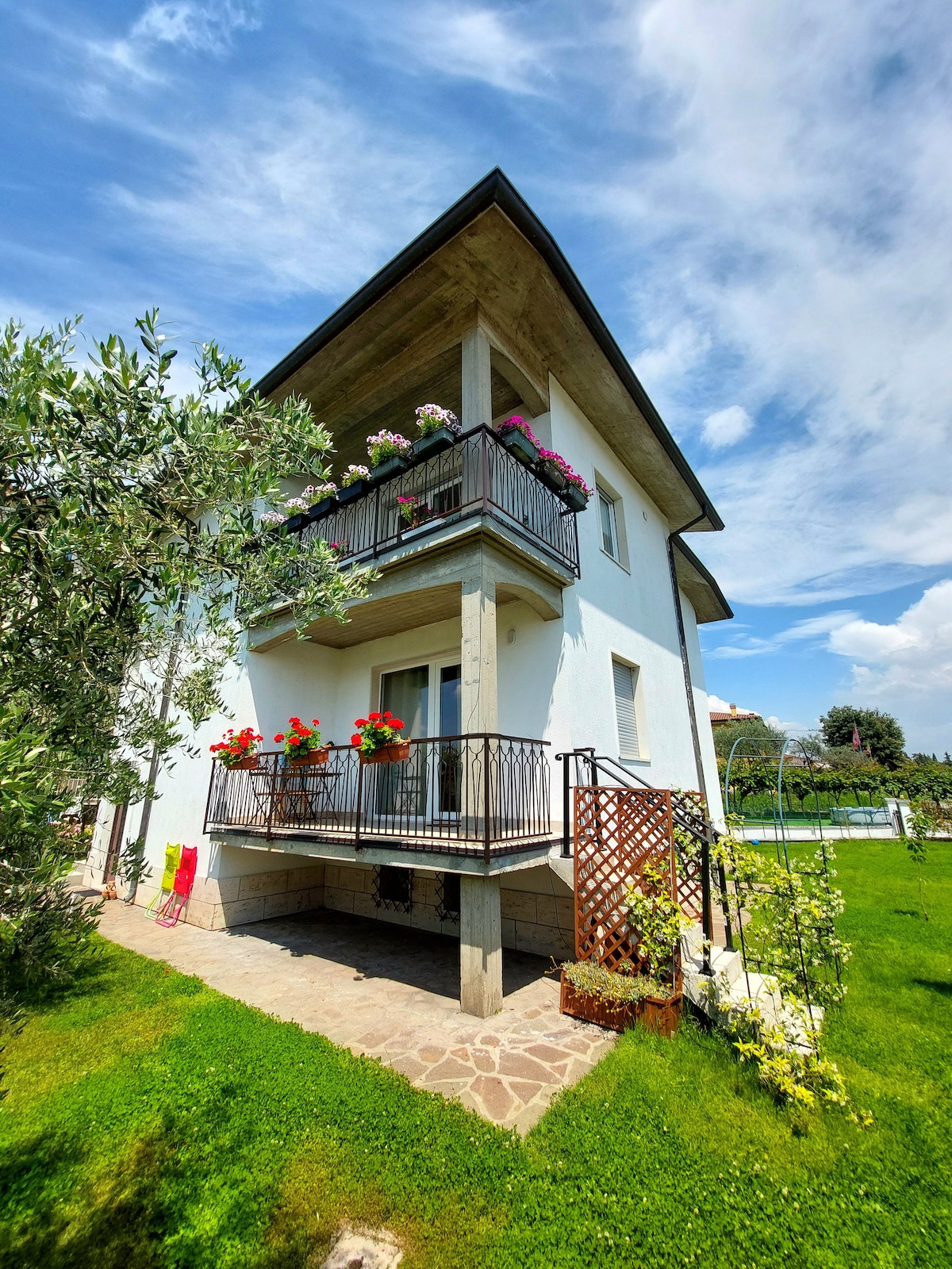At just 5 minutes from the heart of Peschiera del Garda... This independent villa, surrounded by greenery and peace, welcomes you with privacy and comfort. 🏡 Ground floor: 🛏️🚿 1 master suite with private bathroom 🛋️🍽️ Spacious living and dining area 🍳 Fully equipped kitchen with all appliances ☝🏼 Upper floor: 🛏️ 2 large air-conditioned master suites 🚿 1 full shared bathroom 🌳 Outdoor: 🌻 Spacious fenced and furnished garden 🚗 3 private parking spaces