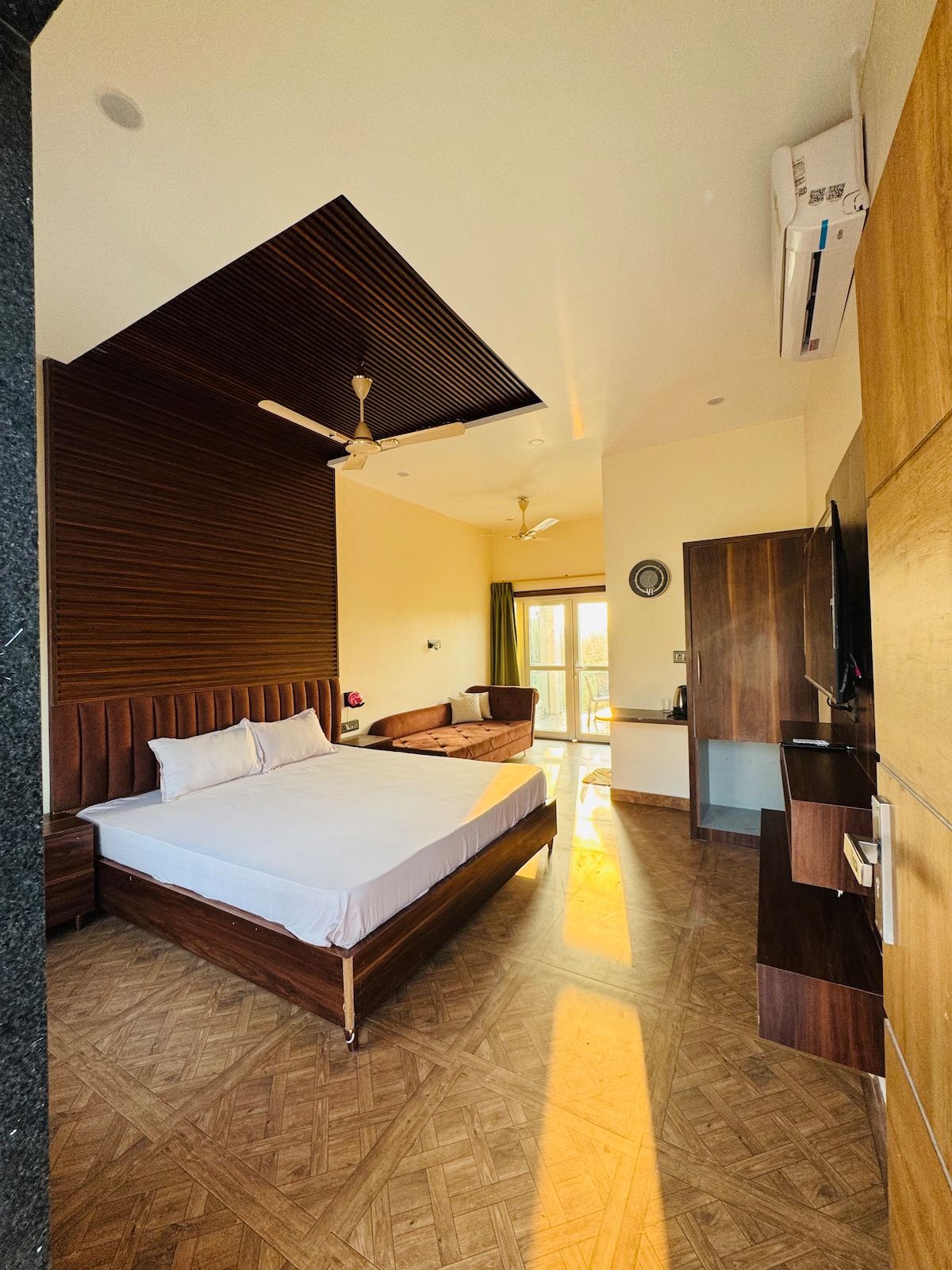 Escape to open fields and slow living at 16th Mile Farmstay, just 16 km from Pachmarhi. This private AC room with balcony overlooks serene farmland and opens into a spacious garden perfect for relaxing evenings. Bonfire available on request. Free parking included. Close to popular local eateries, with assistance for sightseeing, safari bookings, gypsy rides, and local guides to explore Pachmarhi with ease.