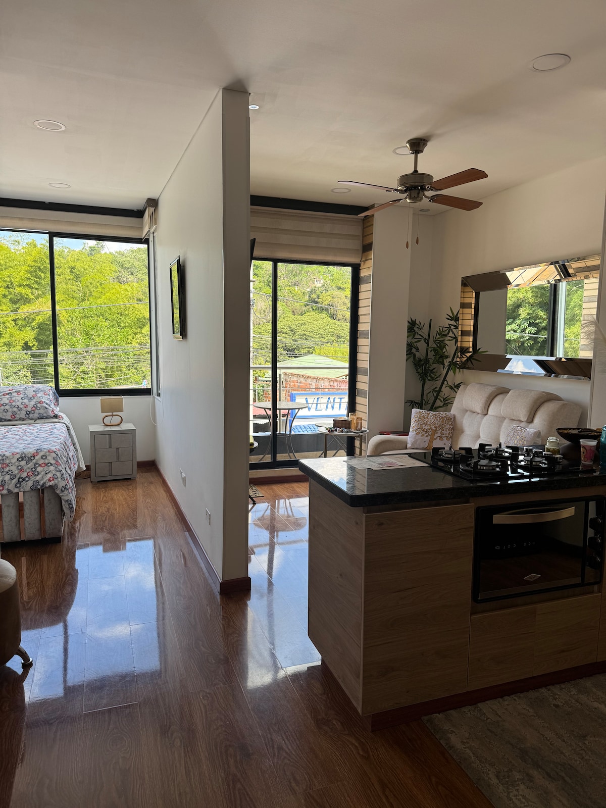 🏡 Apartaestudio moderno y acogedor en La Ferrería, una de las zonas más tranquilas de Pacho. Espacio abierto, luminoso y silencioso, ideal para descansar. Capacidad hasta 4 personas con cama doble y sofá cama. Cuenta con baño privado con agua caliente y ducha múltiple, cocina equipada, Wi-Fi estable, ventilador y balcón con mesa y sillas con vista al barrio y la naturaleza. Piso 2 por escaleras amplias. Sin parqueadero privado, hay opciones cercanas en el pueblo.
