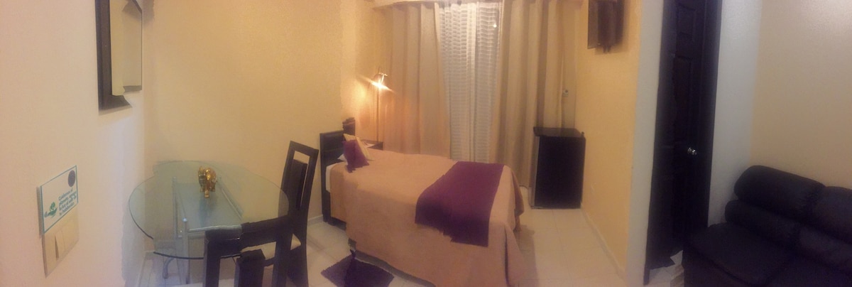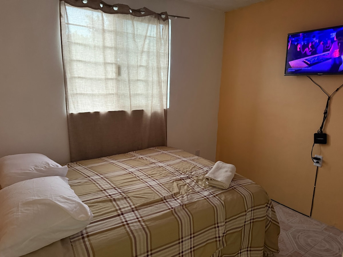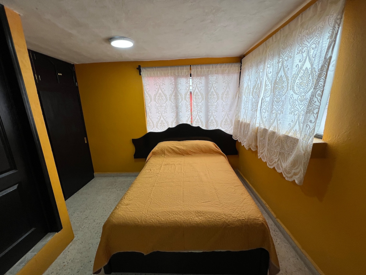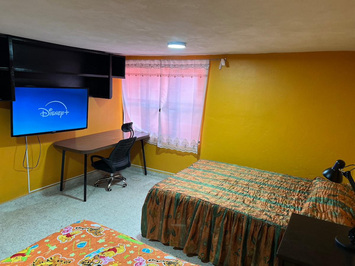 Linda habitación, cuenta con Smart TV 32", wifi 300 MB, area de trabajo, 1 cama matrimonial y un baño completo al interior de la habitación; Ubicada en una zona residencial muy tranquila y segura, a unos 10 minutos caminando de la central camionera y centros comerciales. La habitación esta dentro de una casa pero es independiente, con acceso directo, cuenta con su propio baño, esta en planta baja y el estacionamiento es gratuito sobre la calle. Recepción de mascotas sujeto a disponibilidad.