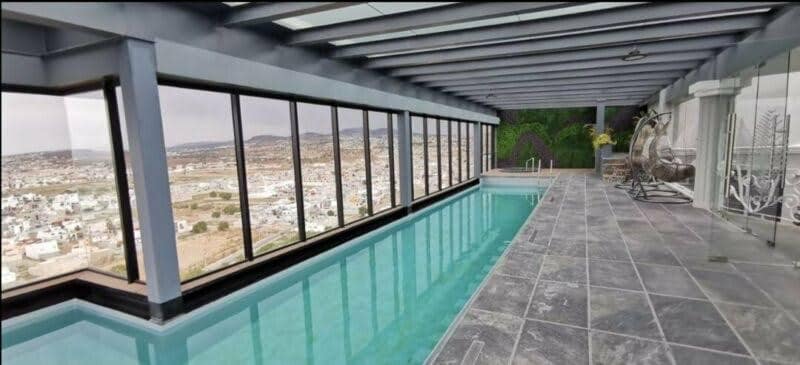 Departamento único, elegante y con acabados de lujo, ubicado en la zona más exclusiva de Pachuca, dentro del centro comercial vía dorada, cuenta con gimnasio, alberca, cancha de pádel, área de roof garden, kids club, spa, estacionamiento para 2 autos. 2 recámaras con baño completo 1 cama king size 2 camas individuales Tina Baño de visitas Sala Comedor Cocina Terraza Cuarto de lavado