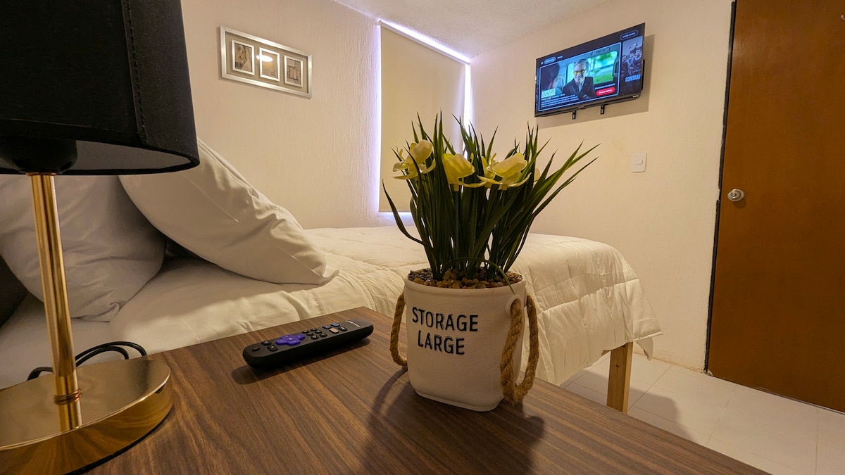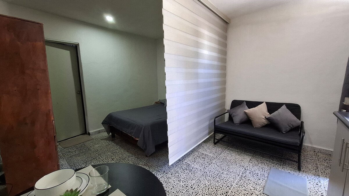 Ideal para tu estancia de un mes en adelante. Ya que no haces ningún gasto extra. Te instalas y a disfrutar del confort del lugar. El mini loft cuenta con todos los servicios incluidos como agua, luz, wi fi, sistema de cable, limpieza,blancos para baño y cama, aseo y sanitización. Cuenta con escritorio - tocador, Closets, cocineta, barra comedor, baño, refrigerador, cafetera, plancha, secadora, pantalla.
