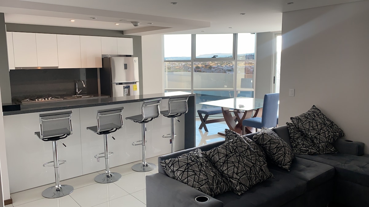 Departamento con 1 habitación privada, con área de cocina, comedor, sala de televisión y dos baños completos. Ubicado en el suroeste de la ciudad. Está a muy pocos minutos de Zona Plateada donde encontraran muchos restaurantes. Incluye: internet de alta velocidad, Televisión (con apps de películas) Amenidades en el último piso que incluyen: Alberca, gimnasio, sala de juegos, salón de usos múltiples, área de masajes, cancha de pádel, jardines con hermoso lago en medio, estacionamiento privado.