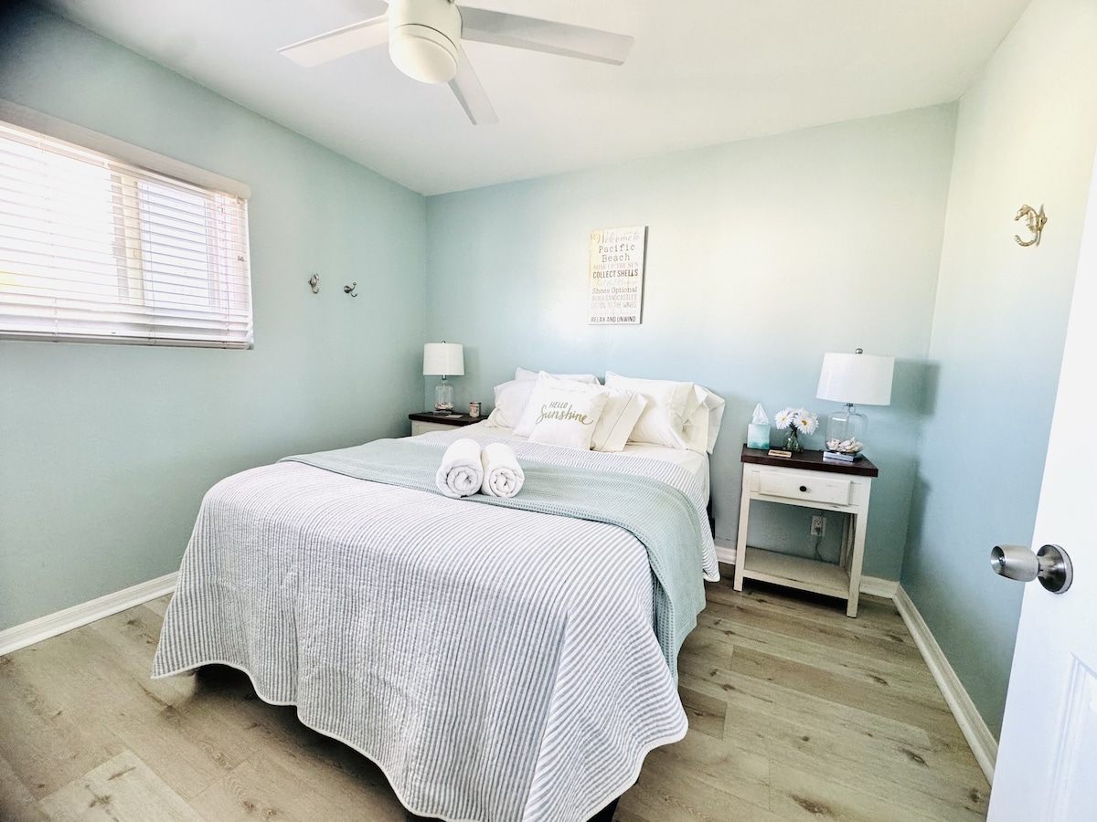 Enjoy the ultimate comfort in this beautifully remodeled condo in Pacific Beach. Smart TVs in every room, flooded with natural sunlight, refreshing ocean breeze and the perfect location— just two blocks from the bay beach, playgrounds, beach fire pits, and the boardwalk. The vibrant main street of PB (Garnett Ave) and the ocean are less than a mile away. Provided are beach chairs, towels, surfboards and boogie boards for you to use. Beds are new (2023) - 1 memory foam and 1 hybrid.