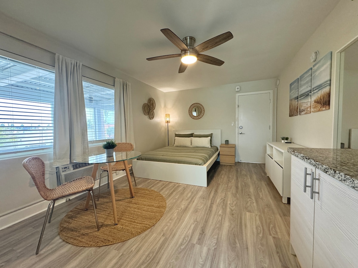 Beautiful bright, centrally located spacious studio unit. 2 Beach Cruisers come with Unit. Smoking/420 allowed on private patio which overlooks our little zen garden. Spa like shower. Easily find safe street parking right in front of property. Fireplace use for Winter, AC for Summer. Hop on the beach cruisers head to the beach 1.3 miles away or the great bars of PB. Pillow Top Luxury Mattress. 55 inch Sony TV w Apple TV. Snacks, Water, Coffee. Beach Towels, cooler and beach chairs provided.