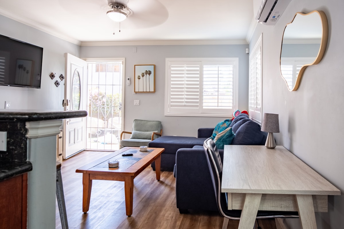 Centrally located in a quiet neighborhood less than a mile to the Beach & Bay. Walking distance to Trader Joes,Vons & many great restaurants.The vaulted ceilings and big sliding glass window allow lots of natural light making the space bright & airy. The balcony is private & has a BBQ and table. This is the perfect spot for families, a couples retreat or business trip. Enjoy all that P.B. has to offer and be able to relax comfortably when you stay at the Jacaranda House!