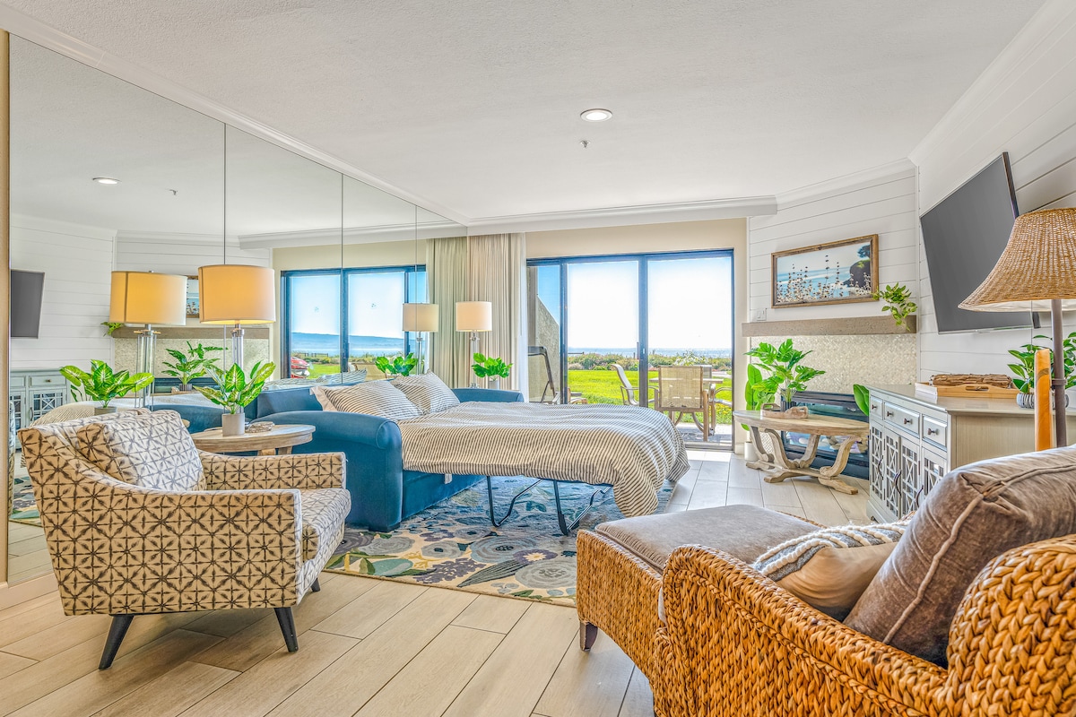 This listing offers an updated residential-style experience within a luxury resort—the best of both worlds! Featuring a primary bedroom with a king bed and en suite bathroom, a 2nd bedroom with a queen bed, and a separate guest bathroom. Enjoy the comfort of a living room with a gas fireplace, a fully equipped kitchen, and sofa seating. Each villa includes a private patio or balcony with an ocean view. Units are individually owned—decor and layout may vary.