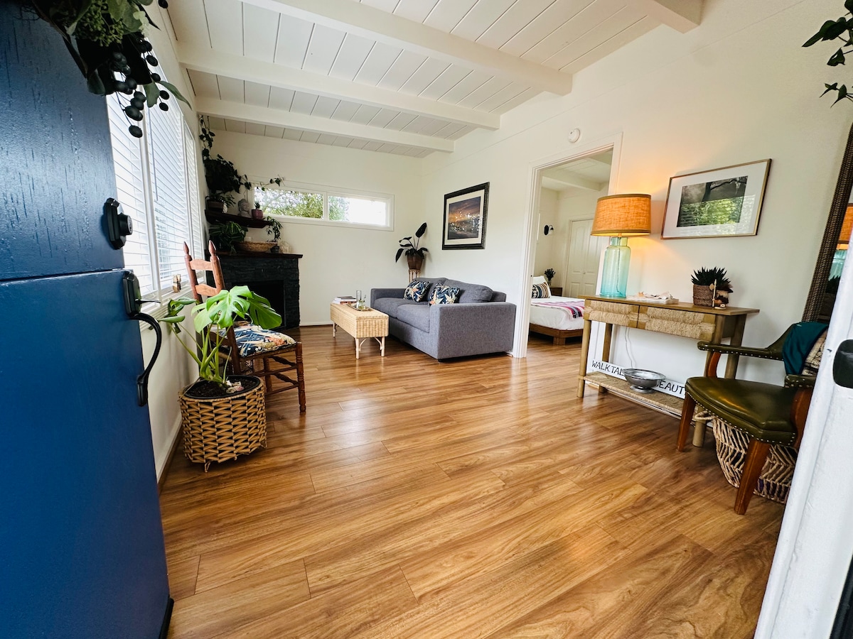 Dog friendly! Private entrance to 2 rm studio overlooking the forest w/ floor to ceiling windows. Queen memory-foam bed, bathroom w/shower & amenities, kitchenette w/ dishes, microwave/convection oven, burner, toaster, coffee.Far ocean view, sunsets, deck, gas grill. wood burning fireplace, complimentary wood, free internet, TV, DVDs, LPS, All amenities. Beach towels/mats, ottoman/cot, free parking. note: ceilings are low in spots & there are some steps. Let us know about dogs when booking.