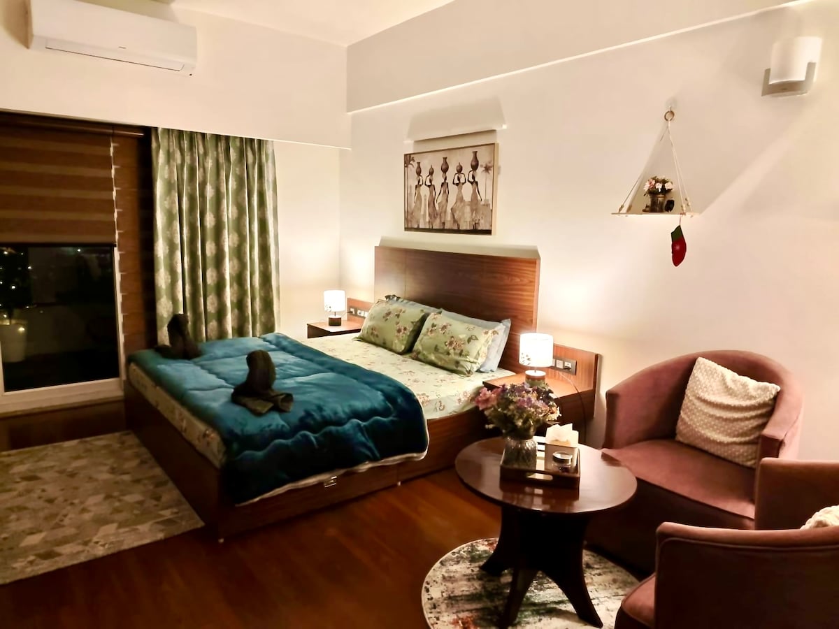 Welcome to Melody by AariaHomez a stunning family friendly luxury apartment nestled in the heart of the mountains, perfect for a romantic getaway or solo adventure. The apartment is just 10 minutes from Pacific mall Rajpur road & 60 minutes from the queen of hills Mussorie. - Comfortable King size bed with premium linens - Offer a kitchenette for your cooking needs - Modern bathroom with essentials provided. - Private balcony to enjoy your morning coffee - Smart TV and High Speed Wi-Fi