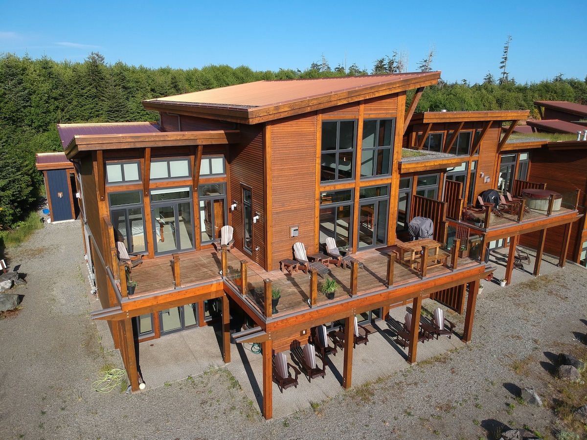 Nestled amidst ancient rainforest, offering views of the Pacific Ocean. These contemporary three-level cabins provide a unique combination of an oceanfront getaway and a serene rainforest retreat. Each floor of these cabins features a private deck, two bedrooms, two bathrooms, a full kitchen, a fireplace, a living area, and a dining area. With direct access to Terrace Beach and The Wild Pacific Trail Lighthouse loop. * Pets allowed: $20 per night, per pet. Max 2 pets. Charged via The Cabins.