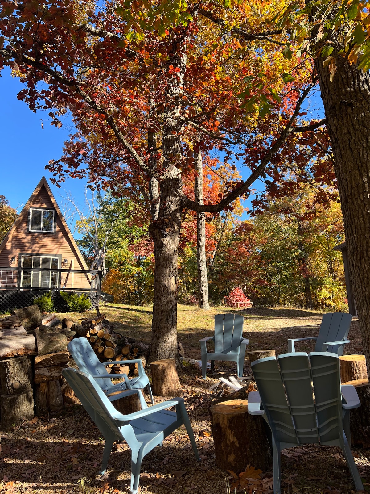 "Up North" cabin decor with modern amenities. Cute A-frame cabin nestled amongst mature red & white pines. Outside space to run & play or relax by the campfire or fireplace inside. Chargrill available. Bring your own charcoal. Living room with TV, dining area, kitchen & pantry, bathroom, & bedroom with a queen size bed on main level. The "loft" upstairs has 2 bedrooms, 1 with 2 twin beds , & the other space with a queen size bed and a reading area that opens up to your own private balcony.