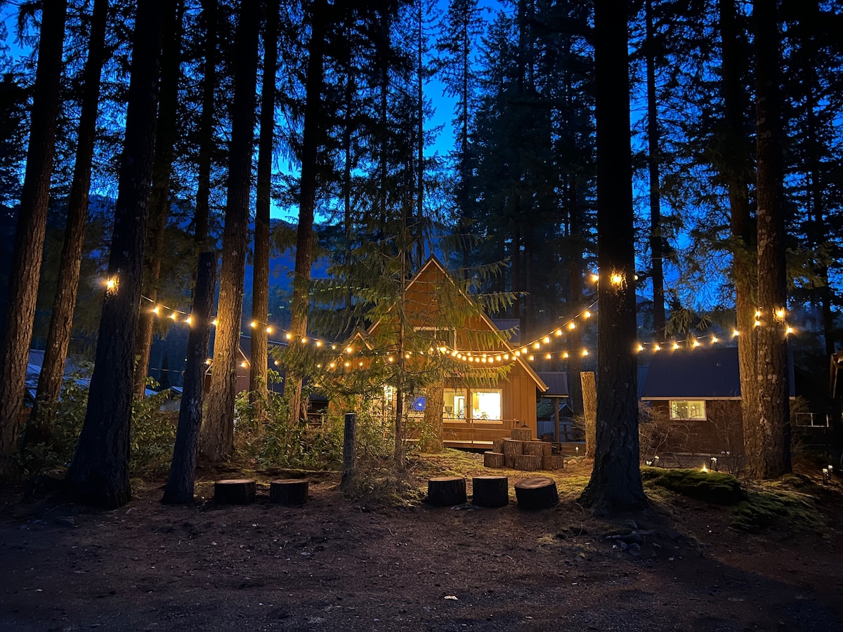 Our adventure getaway mountain cabin is in as good a location as they come! We are in a secluded 5 acre spot of forest land that is next to the national forest. Huge fire pit out back with the national forest and hiking trails literally accessible from the backyard, and the beautiful Cowlitz river swimming hole minutes away. With Mt. Rainier National Park entrance 17 minutes away and White Pass ski resort just 30 minutes out, our little slice of heaven boasts year round adventures!