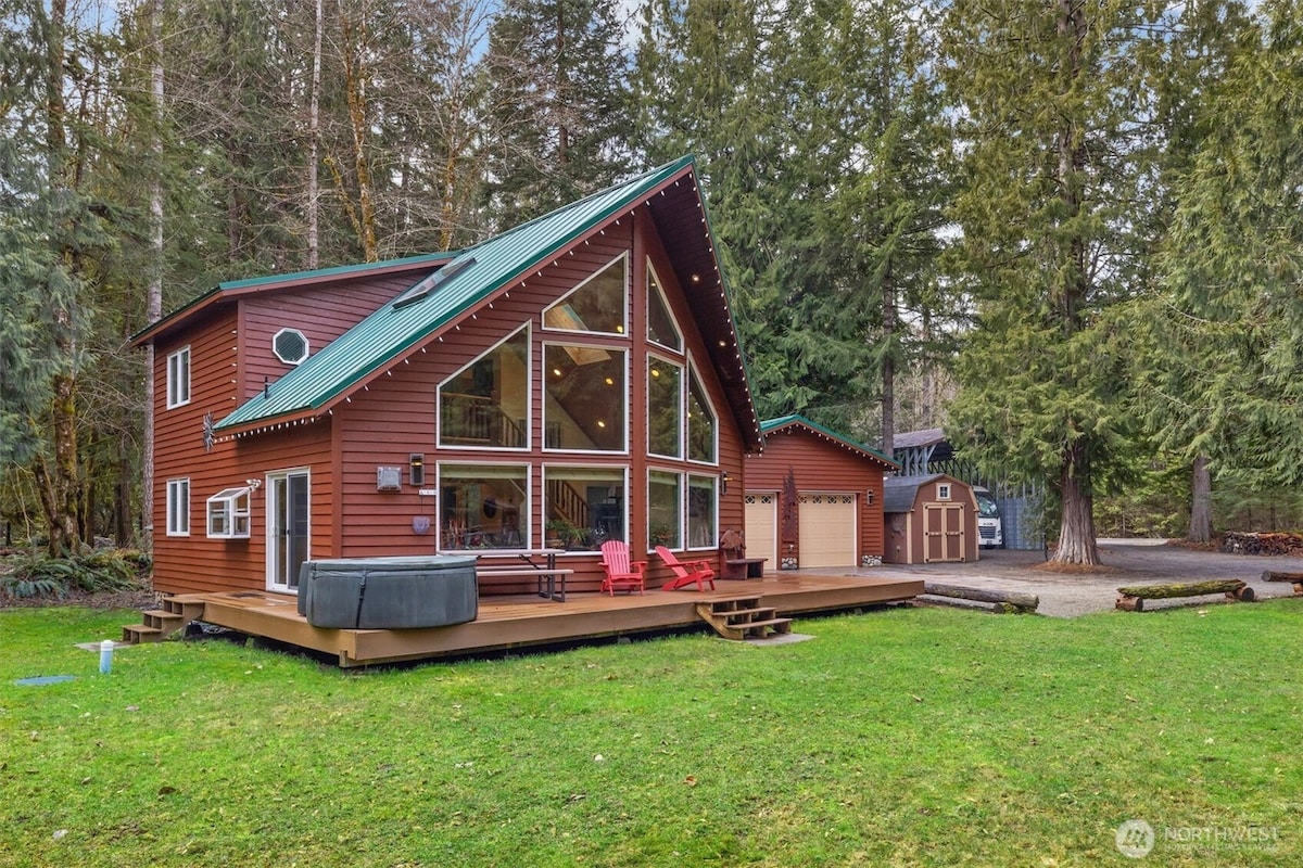 Welcome to Alpinwald (Alpine Forest): the perfect park-like setting for a family get-together, a romantic getaway, a reunion of friends, and everything in between. It offers bright vaulted ceilings, a fully stocked kitchen, a wood-burning stove (also central heat and AC), a well-maintained hot tub, and gorgeously landscaped grounds. Just minutes from Packwood town center, it is an ideal gateway to the Gifford Pinchot National Forest, Mount Rainier National Park and White Pass Ski Area.