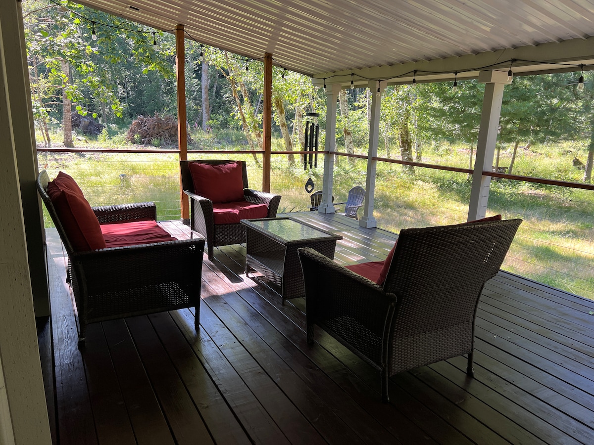 NEW HOME! - Location, location, location! Vacation lodge resides in private gated Elkhorn Community loop with no thru traffic. It is optimally suited for the needs of up to 7 people, with 2 adult couples in queen bedrooms and up to a mix of 3 children/adults in the 3 bunk-style beds in the open loft area. Games, firepit, Roosevelt elk, scenic views, etc... the perfect setting for your mountain getaway. Residing in downtown Packwood, everything you need is a short and simple walk away.