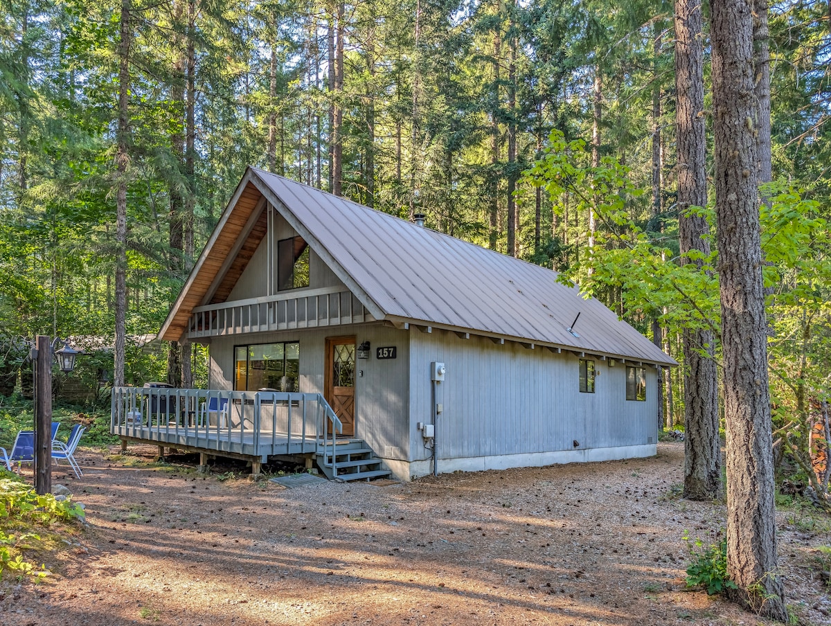 Welcome to Rainier Explorer Cabin in beautiful Packwood, the gateway to Mount Rainier National Park and home to White Pass Ski Resort! This petite retreat(500 sqft)is the perfect home base for all your mountain adventures. The large deck features a 4 person hot tub w/ gazebo and outdoor seating, and leads to the lighted wooded pathway to the firepit. The chabin-chic interior has been newly updated and features an electric fireplace for added coziness! River access is a 5 min walk away as well.