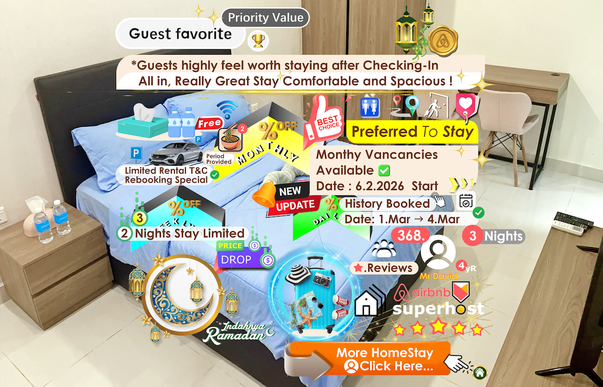 Our homestay located at Kuching city center and at riverbank of Sarawak River. 10mins to tourist centre like Darul Hana Bridge, Kuching Waterfront Musical Fountain, Dewan Undangan Negeri Sarawak, Plaza Merdeka and etc. You can find many local foods nearby our homestay. Within 5 mins walking distance, you can reach Petanak Market. At the 1st floor of the market is foodstalls which can find Kuching local food. And at the ground floor is wet market. Food Panda, Grab Food and Car are easy to access.