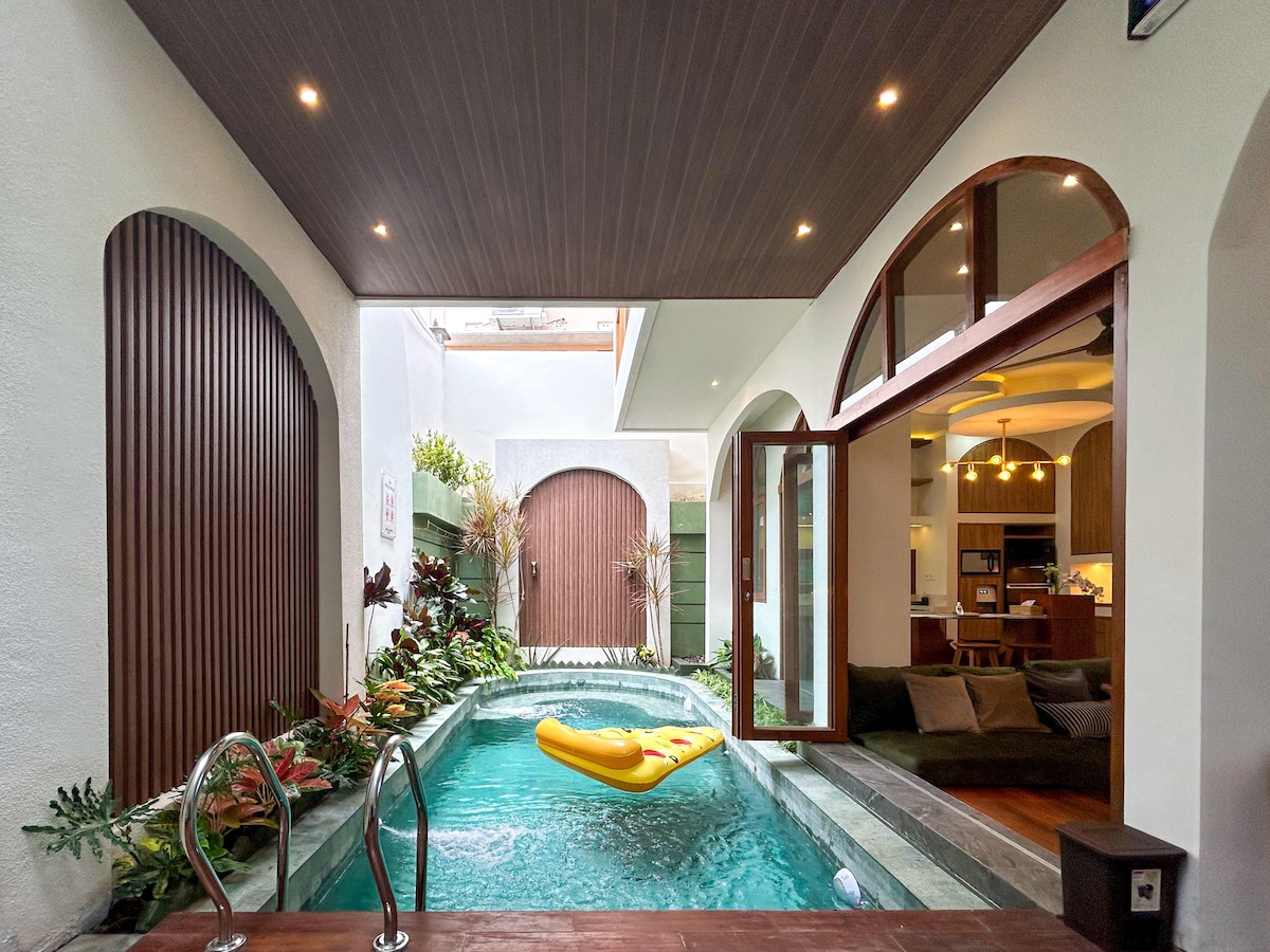 The two bedroom deluxe villa situates in simply the best area of Seminyak, but perfectly hidden in a serene and quiet villa neighbourhood, featuring: 1. private posh pool bar with a swinging love seat 2. sunken seating area in a tropical setting 3. lavish garden by pool 4. a terrace at second floor - enough space chill and soak up the Bali sunshine! Enjoy your romantic private times close to a fine selection of world-class cafes, restaurants and beach clubs.