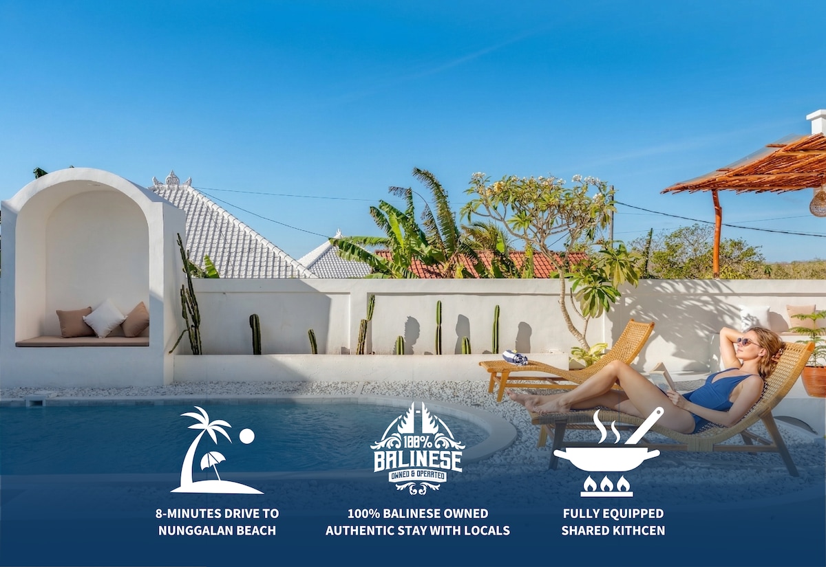 100% Balinese Owned - Authentic Stay With Locals Discover a serene escape in Uluwatu at our guesthouse, where modern comfort meets coastal charm. Just minutes drive from iconic surf beaches, our guesthouse offers tranquility with spectacular views, and a rooftop with panoramic vistas. Perfect for solo travelers, couples, or small groups, it's the ideal base to explore Bali's vibrant culture. Key Features: - Bedroom w/ AC - Charming shared pool - Shared kitchen - Rooftop w/ sunset panorama