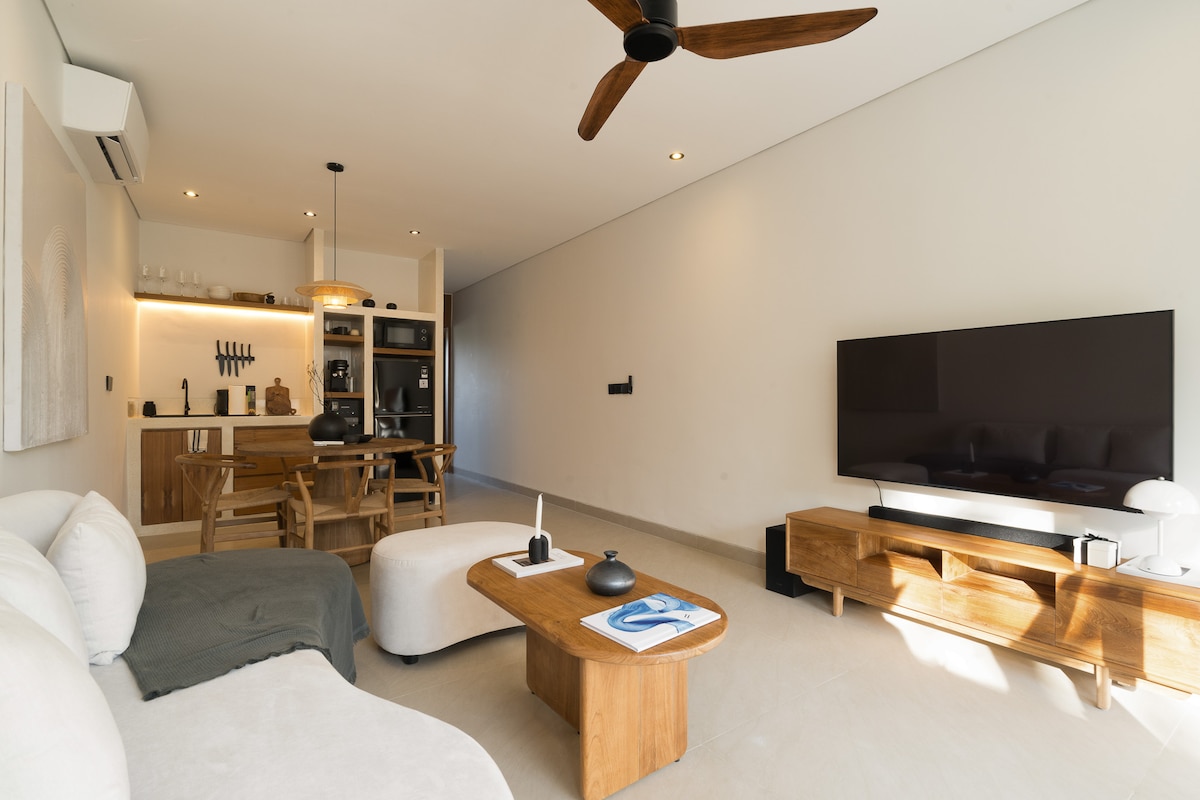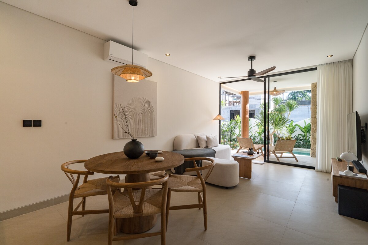 Fall asleep to the sound of waves below the cliff and wake to uninterrupted ocean blue. This one-bedroom apartment sits between the cliff edge and Padang-Padang Beach, with the sea filling the room through a wide glass window and balcony opening. Made for couples who want privacy, surf energy, and a calm place to retreat after the beach.