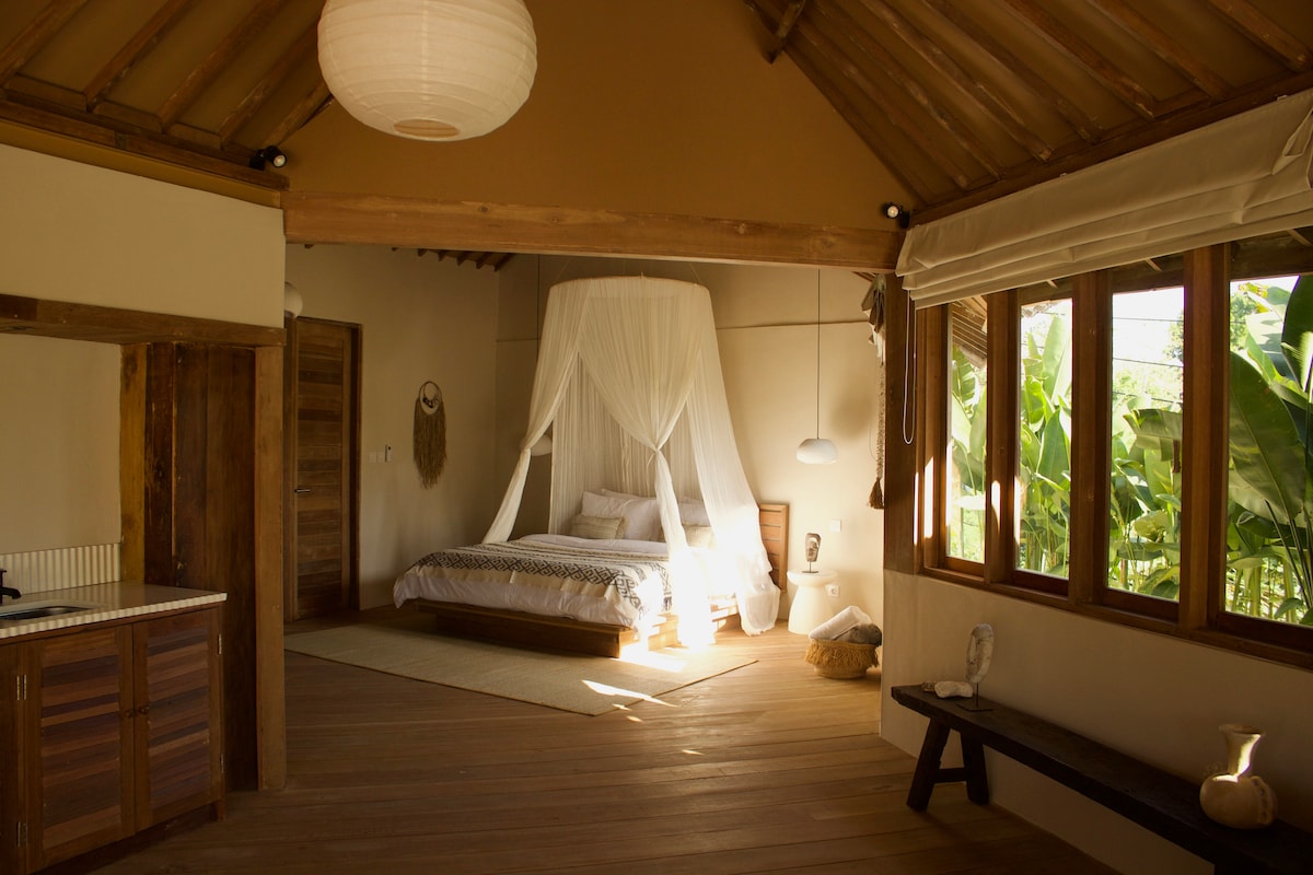 Calista Studios are comprised of 4 x 1 BR studios, situated side by side, each with their own unique style. Nestled in a peaceful Balinese neighborhood, this is a perfect retreat for creatives and travelers who appreciate the beauty in intricate details. With its 2 floors, the clever design maximizes functionality with a cozy, comfortable atmosphere, spacious king-size bed, fully equipped kitchenette, and a work-friendly nook that's ideal for writing, sketching, or planning your next adventure.