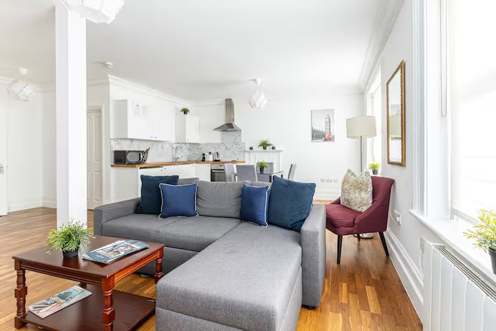 Stylish 1-Bed step-free Flat Near Paddington & Hyde Park. Moments from Paddington Station and Hyde Park, this stylish flat features a bright open-plan living area with fully equipped kitchen and breakfast island, a dining table for four, and a sleek bathroom with walk-in shower. The double bedroom offers great storage and comfort. Tucked away on a quiet street, it offers easy access to shops, cafés, transport links, and London’s top attractions – ideal for a city break or business trip.