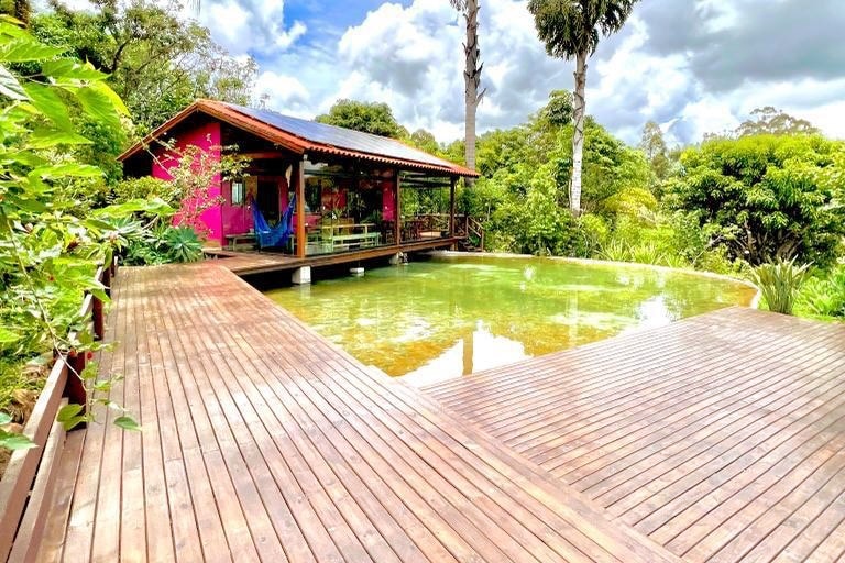 Chalé charmoso, acolhedor, situado em chácara de 20.000m2 de mata nativa preservada. Localizada no Lago Oeste, a 30 min do centro de Brasília. Ideal para quem busca paz, tranquilidade, boas vibrações, mas não quer abrir mão do conforto e do Wi-Fi. Oferece experiências únicas: comer frutas no pé, contemplar o céu estrelado, ouvir o canto dos pássaros. Construção sustentável, ventilação agradável que dispensa ar-condicionado, possui vista deslumbrante, piscina natural sem uso de produtos químicos