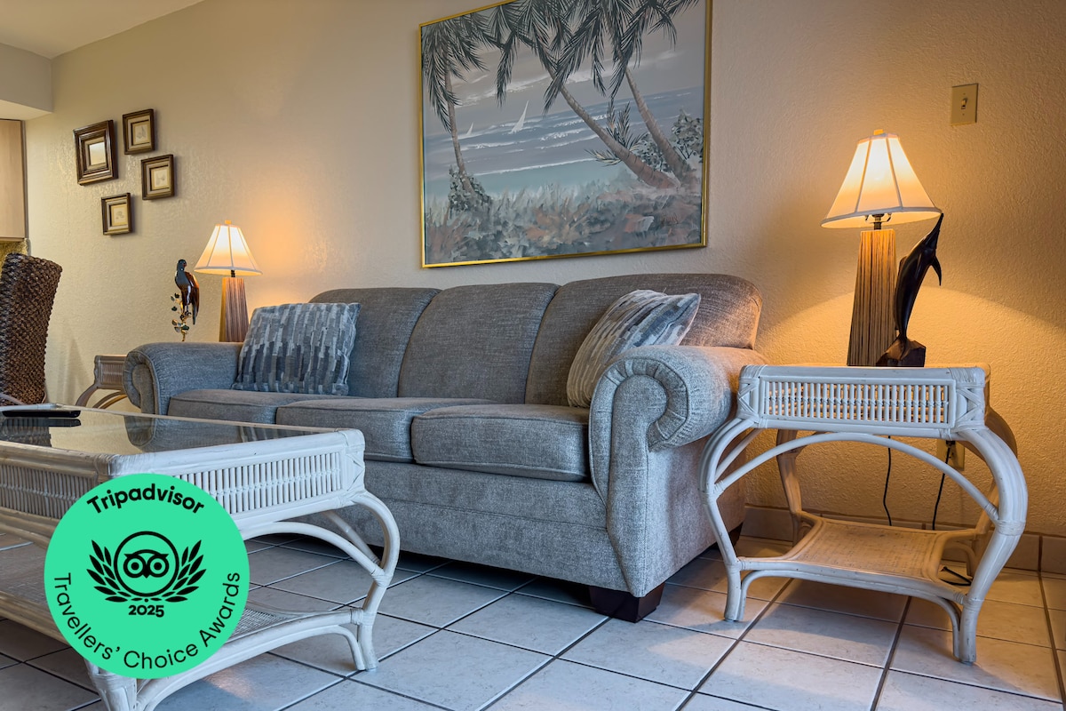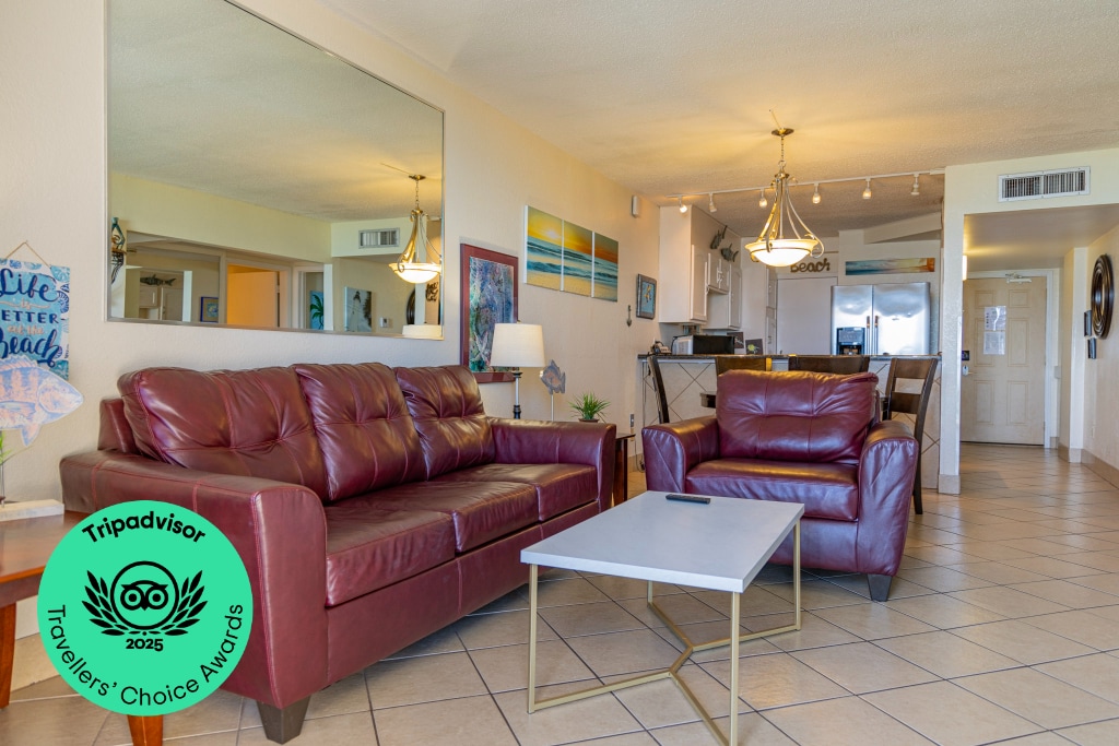The Isla Grand Beach Resort condo features views of our pools, along with beach views. Condo #305 rooms accommodate up to 6-ppl with 1-king bed, and 2 twin beds in the second unit, and a sofa sleeper in the living room Our Condo unit Features: 2 Balconies 3 Televisions with 74- Spectrum channels Sleeper Sofas in selective rooms (included) Iron and Ironing Board Hairdryer Full size refrigerator Full size kitchen Free Wireless Internet Digital In-Room Safe at this cheerful getaway.
