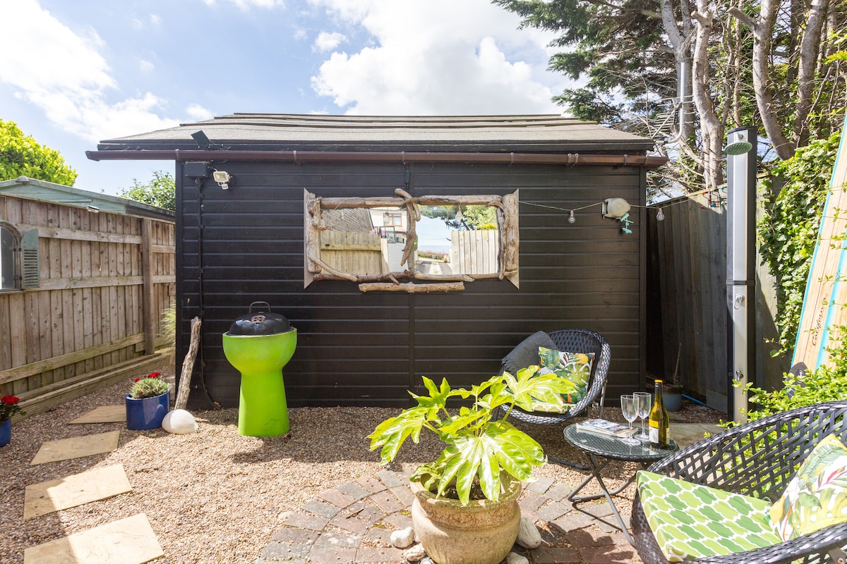 Fistral Studio is a bijou beachy chalet only a few minutes walk from the gorgeous Fistral Beach. Fully redecorated in Jan 2024. Also close to Newquay Town Centre it has off street parking and its own outdoor space. The studio has everything one or two guests could need; double bed with sprung mattress, well equipped kitchen, shower room, table, and free fast WiFi. And an outdoor shower and BBQ. We can accommodate an infant and have a travel cot available to hire, please mention when booking.