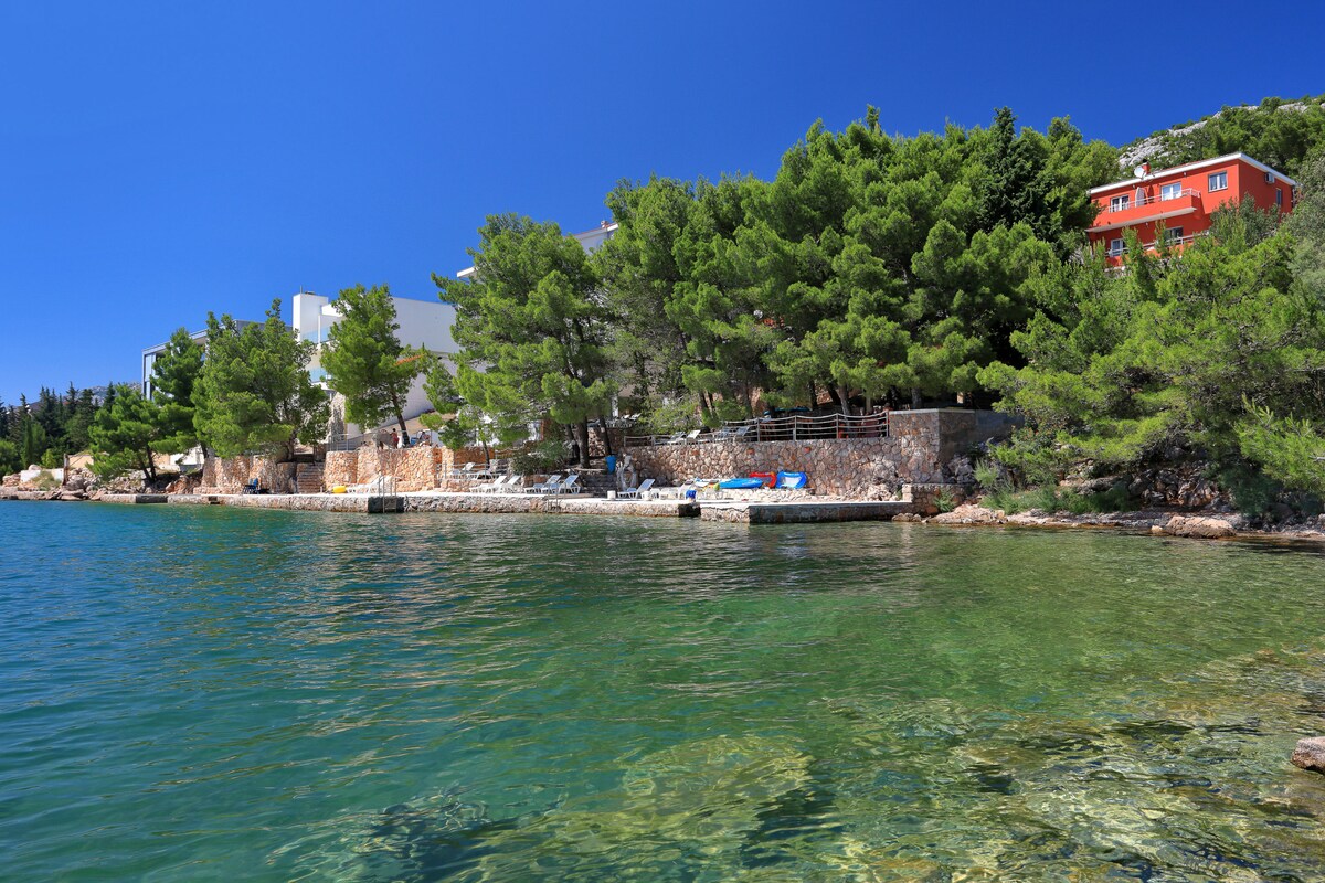Perched on steep rocks, 30m above the sea level, this idyllic studio is a perfect getaway for a much needed vacation. Surrounded by a vegetation reserve of Dubrava-Hanzine, it offers a luxurious experience - the sweeping views of the Pag Bay and the mountain range of Velebit, for one. Beach Rozin Bok 50m from the apartment. Parking, A/C, outside grill, and outside solar shower included. SUP and kayak are available during the stay in the apartment.