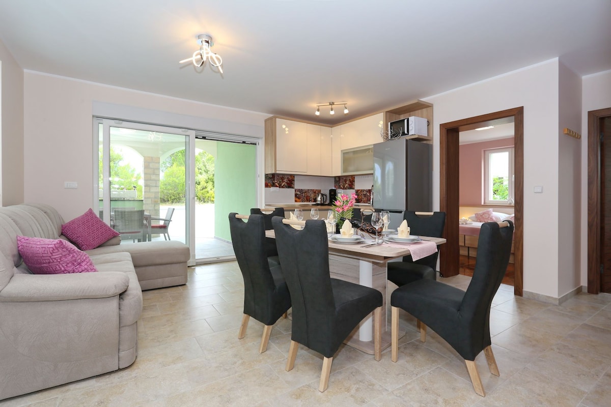 Ovaj je smještaj prikladan za obitelji i manje grupe. Nalazi se u centru grada, pa će vam svi sadržaji biti nadohvat ruke. Plaža ,restorani,barovi i supermarket su dostupni pješice. Gostima su na raspolaganju besplatan parking, dva bicikla, roštilj i WIFI. Kuća se sastoji od tri spavaće sobe sa bračnim krevetima, dvije kupaonice, dnevnog boravka sa blagovaonicom i terase. Bazen i svi sadržaji su privatni. Naša obitelj vam želi ugodan boravak.