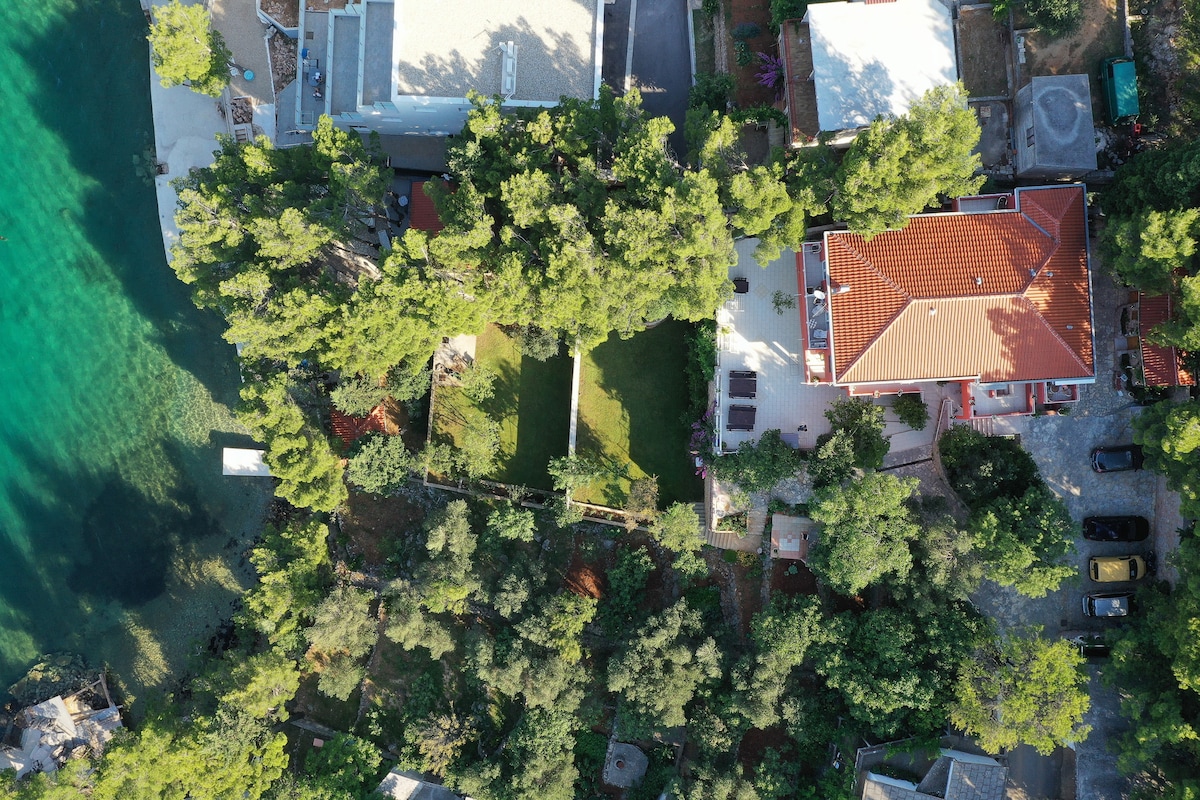 Enjoy the comfortable, quiet, imaginatively decorated 3 bedroom house on the sea with a private beach. The shade of the pine trees, breathtaking view of the island of Pag, meals on the terraces over the sea will make your holiday unforgettable.