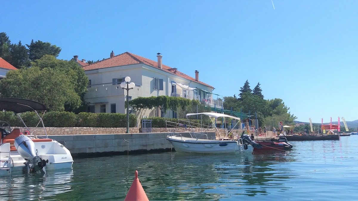Apartment (40m2 for3 persons) Big terrace with beautiful view. In Diklo,10 m from the sea/beach. Shop & restaurant 50 m, sandy beach 200 m. 70 m from the centerParking & bus station in front of the house. ..This house is located in the center of Diklo.and so is the beach,across the apartment.the tennis court and the restaurant Taverna 50 M RANGE FROM THE HOUSE, as well as 2 caffes are located within 50m range from the house.the sea and the first beach are located right across the apartment.