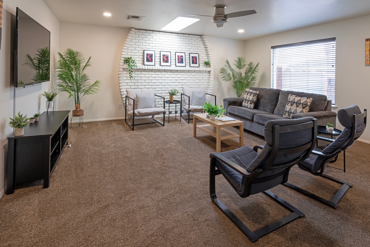 Clean, modern & spacious retreat to relax that's only 8 minutes from Horseshoe Bend & 11 minutes from Antelope Canyon. Come & enjoy the luxuries of home & unwind in our curated space in-between your desert & lake adventures. Grill & sit around the fire pit at sunset, enjoy desert views & gaze at the stars before heading inside to watch a 75” HDTV, play arcade games, foosball, or table tennis. 3 minutes drive to supermarkets & all of the main restaurants downtown. Fast WiFi, washer/dryer, parking