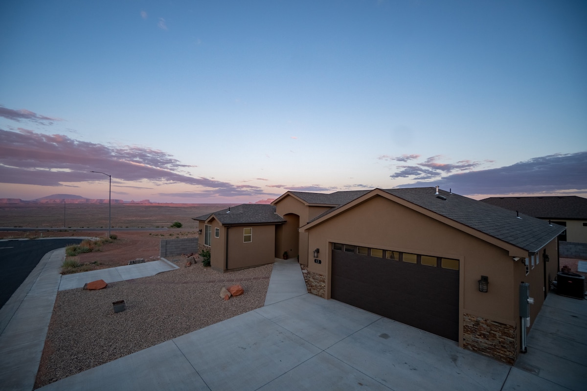 Enjoy breathtaking views all day from this large, open & modern space. With 20ft ceilings & wall to wall windows, enjoy the areas natural beauty from the comfort of home. 3 large bedrooms & 2 bathrooms split on 2 floors with 2 additional roll outs. Horseshoe Bend is 5 mins away and Antelope Canyon & Lake Powell are 10 mins. BBQ, dine or stargaze from the back yard & upper deck, sit around the fire pit, enjoy a game of shuffleboard, foosball, darts or arcade basketball, 5 TVs, fast Wifi, laundry