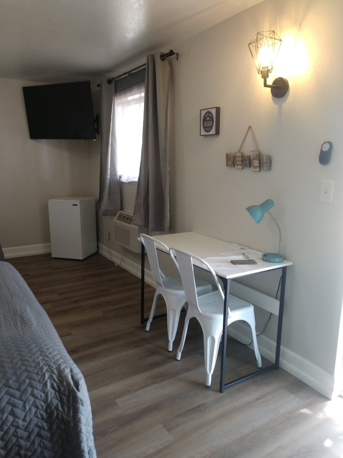 Large King Bedroom with flat screen tv, Cable & internet. It has handicap accessible shower, min fridge, microwave, outdoor seating, BBQ, available and use of the fully equipped community kitchen. The kitchen is equipped with cookware, cutlery, appliances, coffee, large dinning table for that at home feel, and a desk for working.