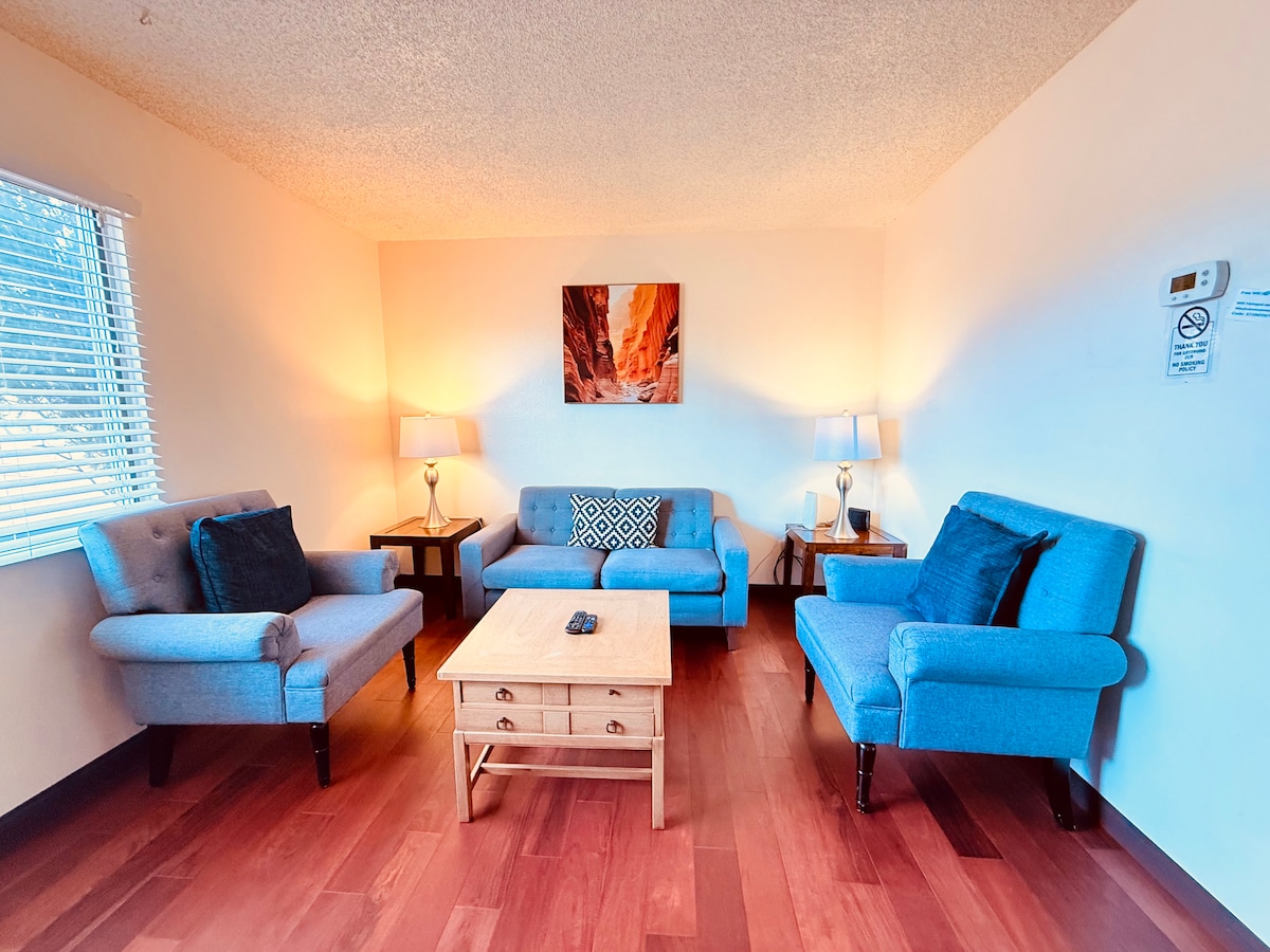 Welcome to this 2 story Townhouse. Fully furnished with 2 bedrooms upstairs and a dining area, kitchen, and living room below. Central air included. Laundry access. Late check ins are welcome. Very quiet peaceful part of town and conveniently located within 10 to 15 minutes drive from most of the major attractions such as horseshoe bend and the parking lot entrances of both Upper and Lower Antelope Canyon. Free vehicle, trailer, and boat parking included.