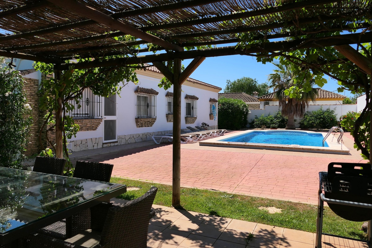 Bonito chalet con gran zona ajardinada. La vivienda consta de tres dormitorios dobles, cocina equipada, baño y salón. Cada dormitorio tiene un ventilador de techo. La zona ajardinada dispone de un gran patio y zona para aparcar. También tiene de piscina privada de agua salada con zona de solárium y zona de burbujas, además ducha y un aseo exterior. Disponible barbacoa de gas, barbacoa de carbón y paella. A solo 12 min en coche de la playa.