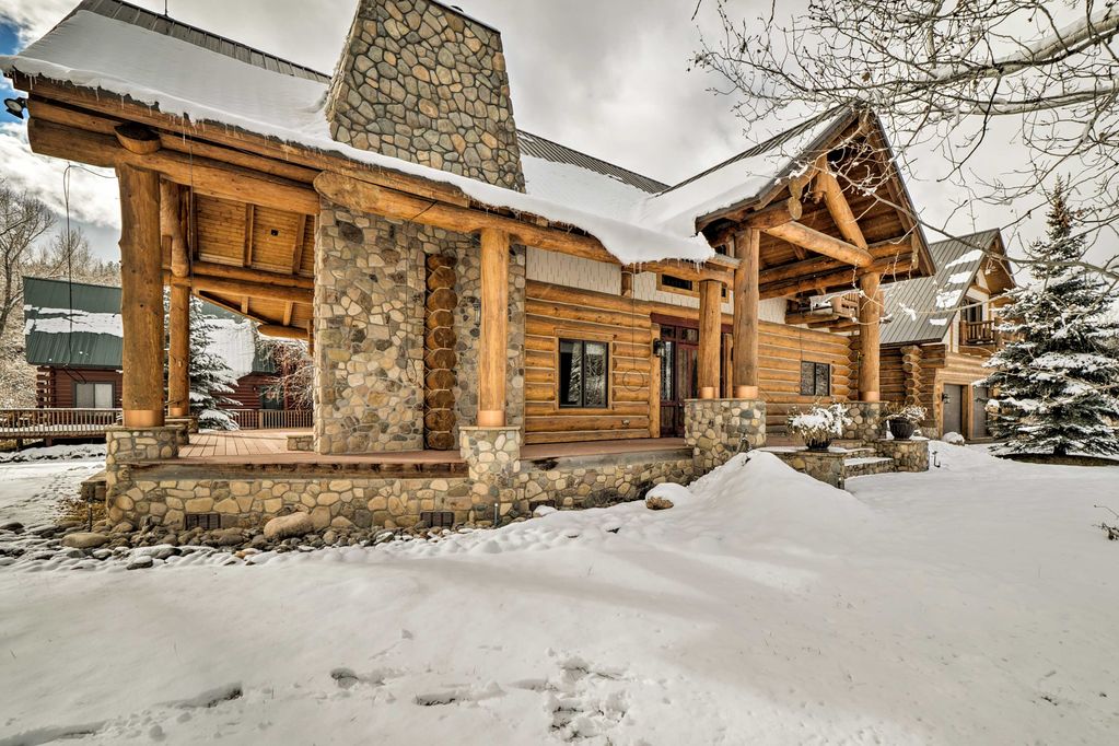 Secluded-feel cabin on 8 acres: spotless, well-stocked kitchen, deck + hot tub, and epic views. Rustic-modern 2BR cabin with panoramic views, Starlink internet, dual monitors, private workspace, EV charger, portable A/C. 8 mins to town, 40 mins to skiing. Permit #036274