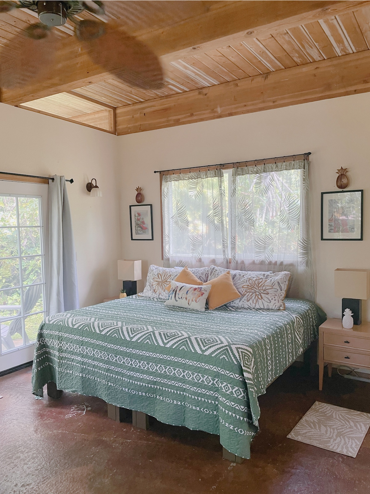 The unique 12-sided architecture includes high-pitched ceilings, Balinese hardwood floors, interior cedar siding w/ Redwood rafters, four screened doors and several screened windows and two Haiku ceiling fans to offer plenty of air-flow and natural light. A large dome skylight offers views of palm trees during the day and the stars at night. With a beautiful, fully-outfitted kitchen that includes spacious, granite countertops, a six-burner gas stove, oven, large refrigerator and a central island, there is plenty of room to prepare meals and to entertain. The well-appointed furniture includes a comfortable day bed, an over-sized, cozy papasan, a custom, artisanal desk, and an organic latex queen-sized bed with 100% cotton, high-thread count sheets.