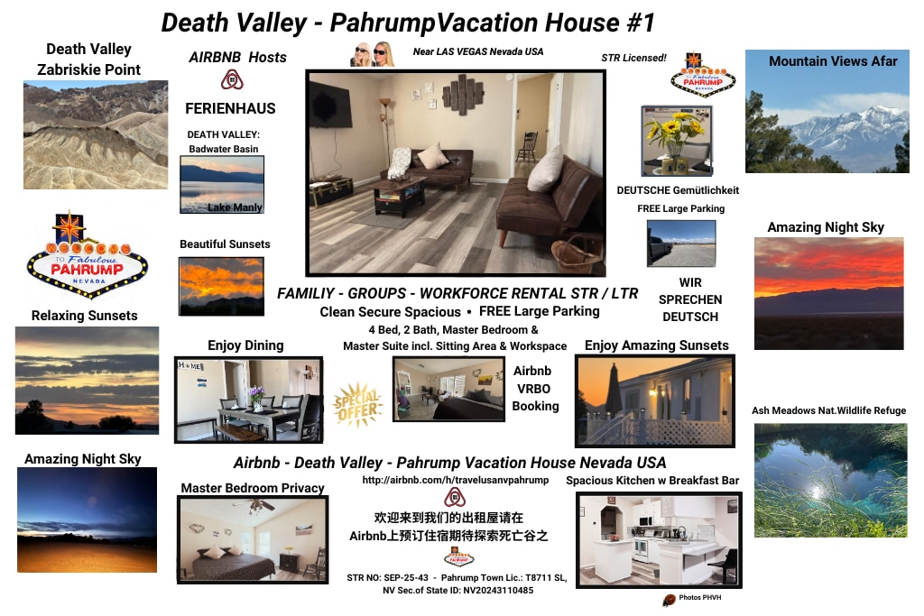 close to town shopping, casinos and restaurants, located between Death Valley (about one hour) Prairie Fire about half hour. one hour from the airport and the strip. The house has fully equipped kitchen, a dining room, Livingroom with T.V.- 3 bedrooms, 2 with queen beds and 1 bedroom with 2 twin beds. Livingroom has a pull out sofa and a recliner chair. The 2nd bathroom has a tub/shower. Also has a laundry room.
