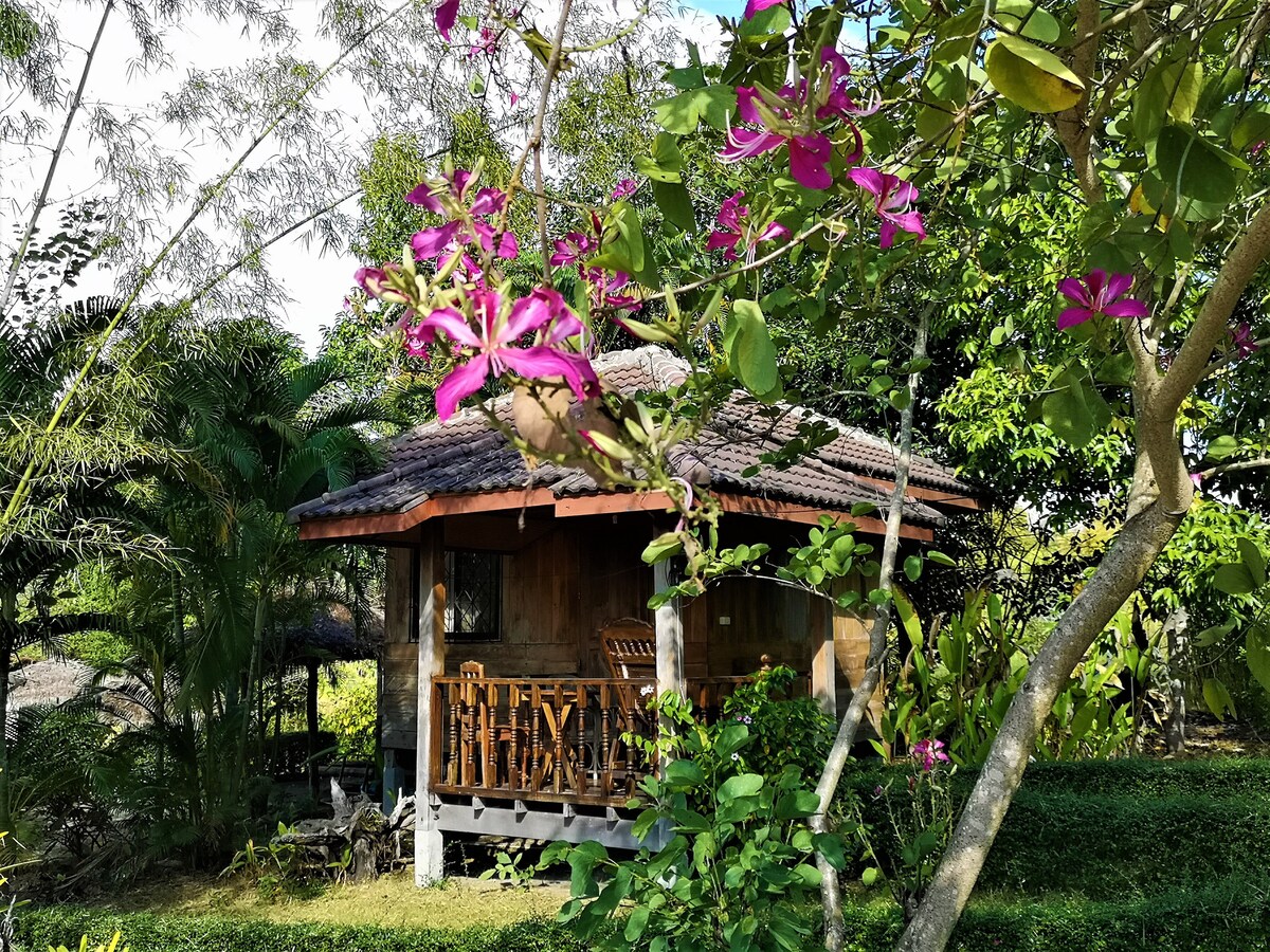 We keep it simple here. 1 km walk from Pai walking street. Peaceful setting tucked away from all the noise. Rise with rooster crowing in the morning with cat and dog playing in the garden, walk in the paddy field and feed the cow with banana during the day, and enjoy quite afternoon sun set. All cottages equipped with aircon and private bathroom. Simple breakfast toast, tea and coffee are available in the morning.