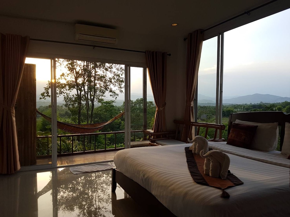 Located just 15-20 minutes walk into town, fully furnished, you can see Pai city, mountain view and rice paddies with magnificent views from 180 degrees, breezy, it features new furniture. This is one of the most peaceful locations in Thailand.